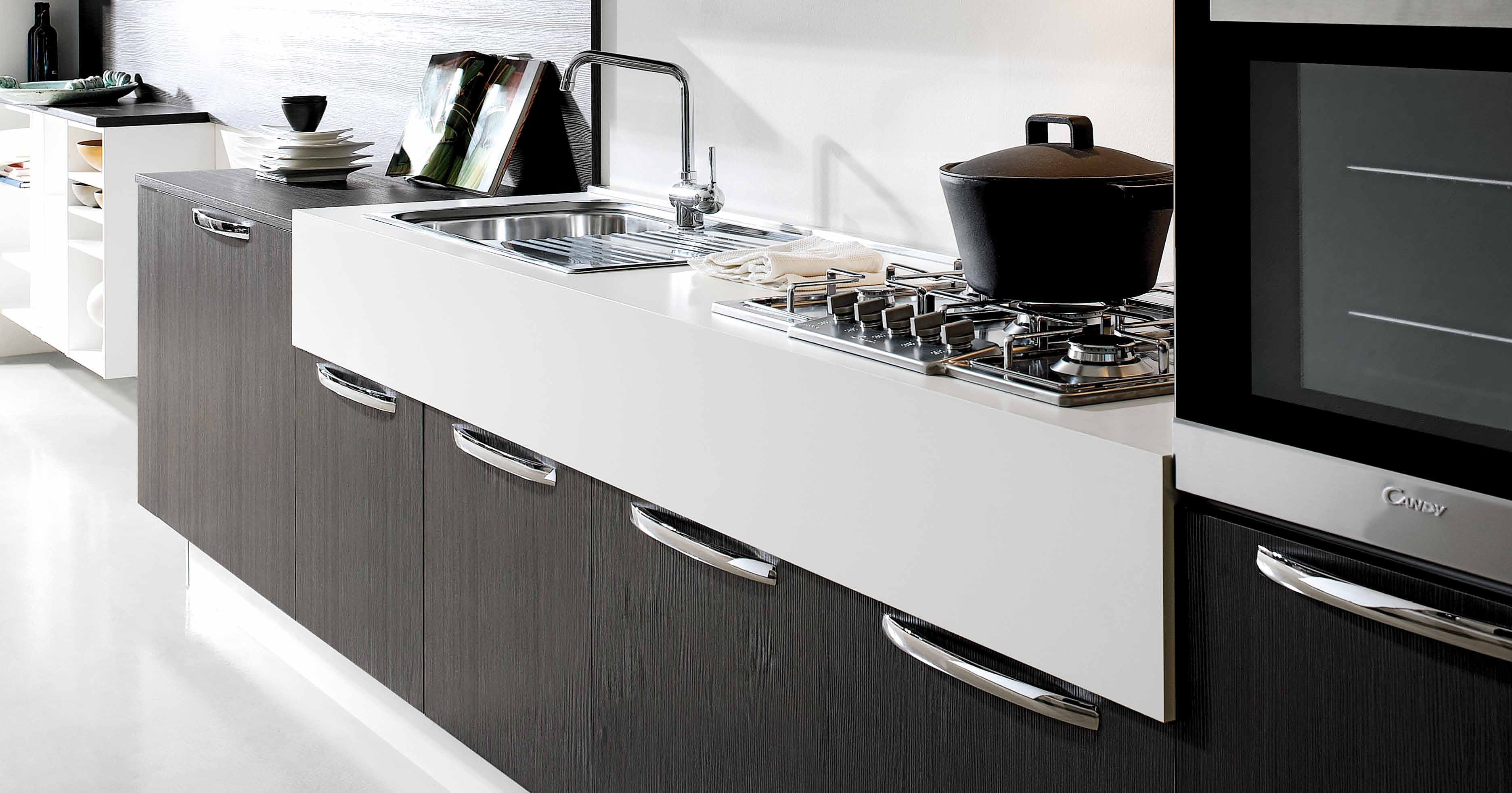 Kitchen (kitchen set) Erika from the Italian manufacturer Aran Cucine. The case is MDF wood. Glossy chrome-plated handle model Arco