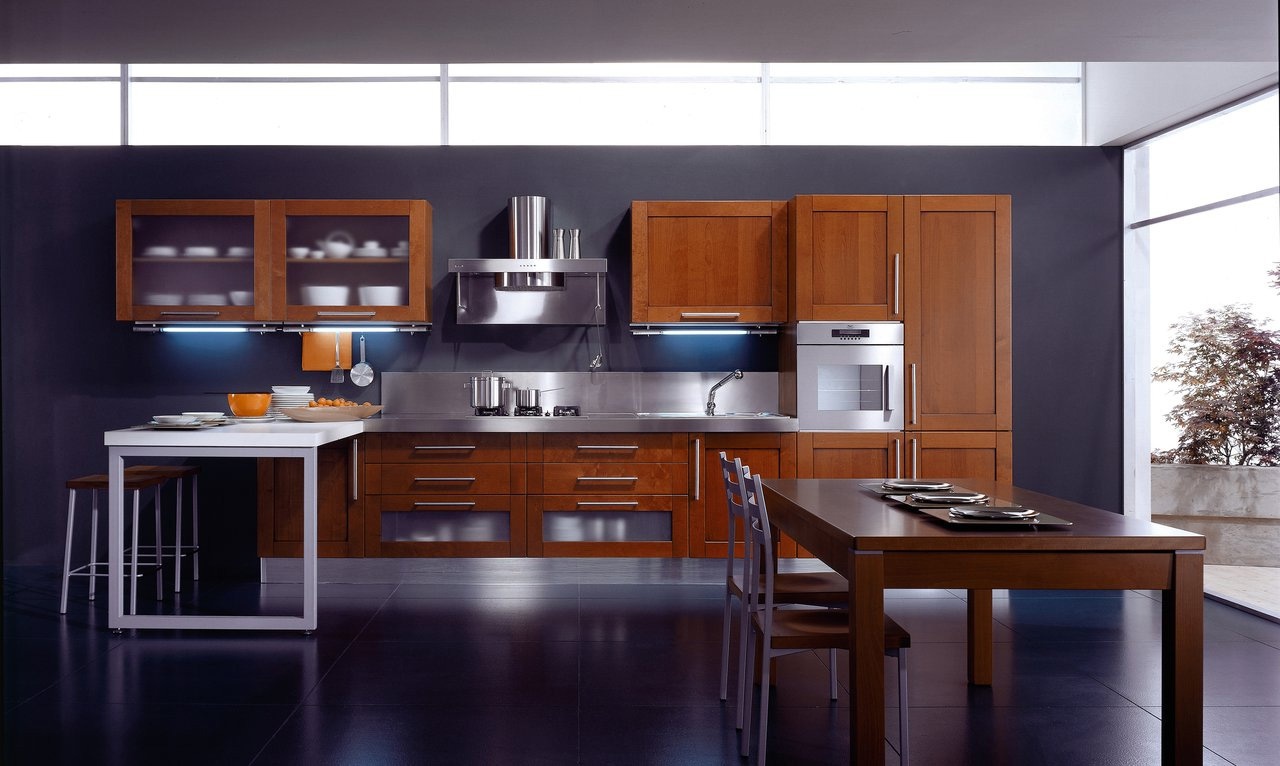 Kitchen (kitchen set) Teca from the Italian manufacturer Aran Cucine. Practicality and sophistication in every detail, large roomy elements and wall cabinets with a convenient vertical opening: strength and simplicity, made with the utmost care. Kitchen with a special charm beyond time, made of solid cherry, modern lines.