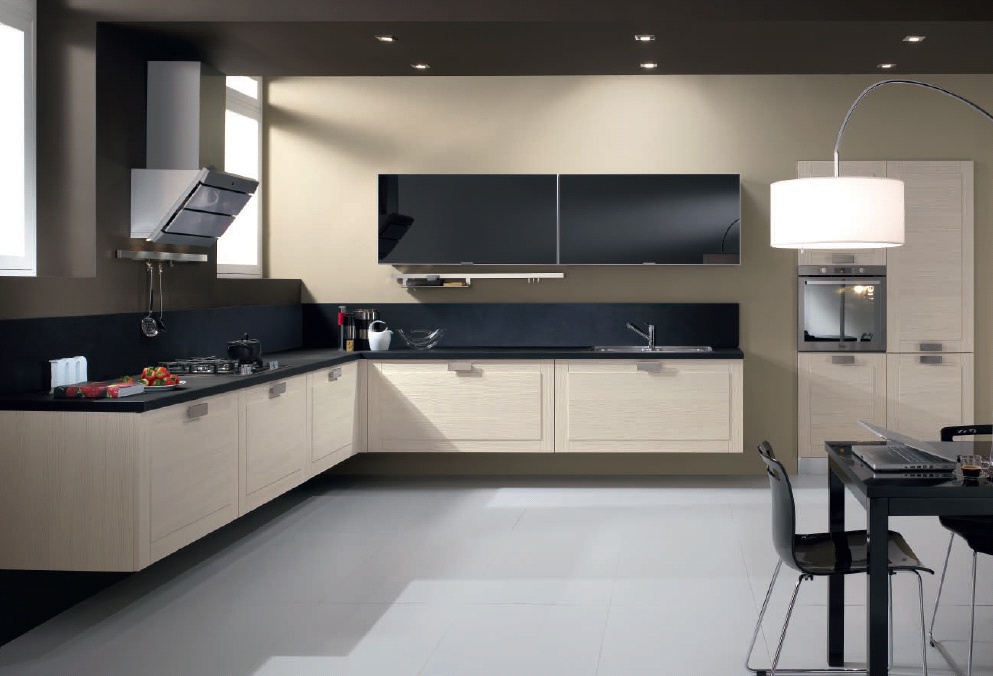 The model is made in modern style. The factory has departed from the standards - the project presents special hanging cabinets. Legs and base are not used. For home appliances there is a separate sliding columns. Hinged modules with glass in aluminum frame. Completing and filling of the cabinets according to the customer to order.
