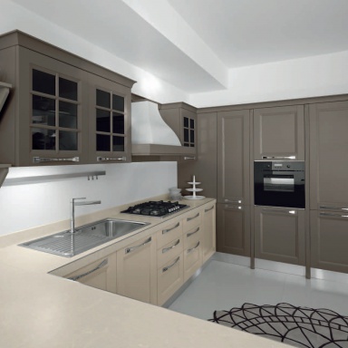 Kitchen (kitchen set) Ylenia from the Italian manufacturer Aran Cucine. The case is natural wood. Finish lacquered beige and mink. Accessories chrome steel. The model is made in classic style.