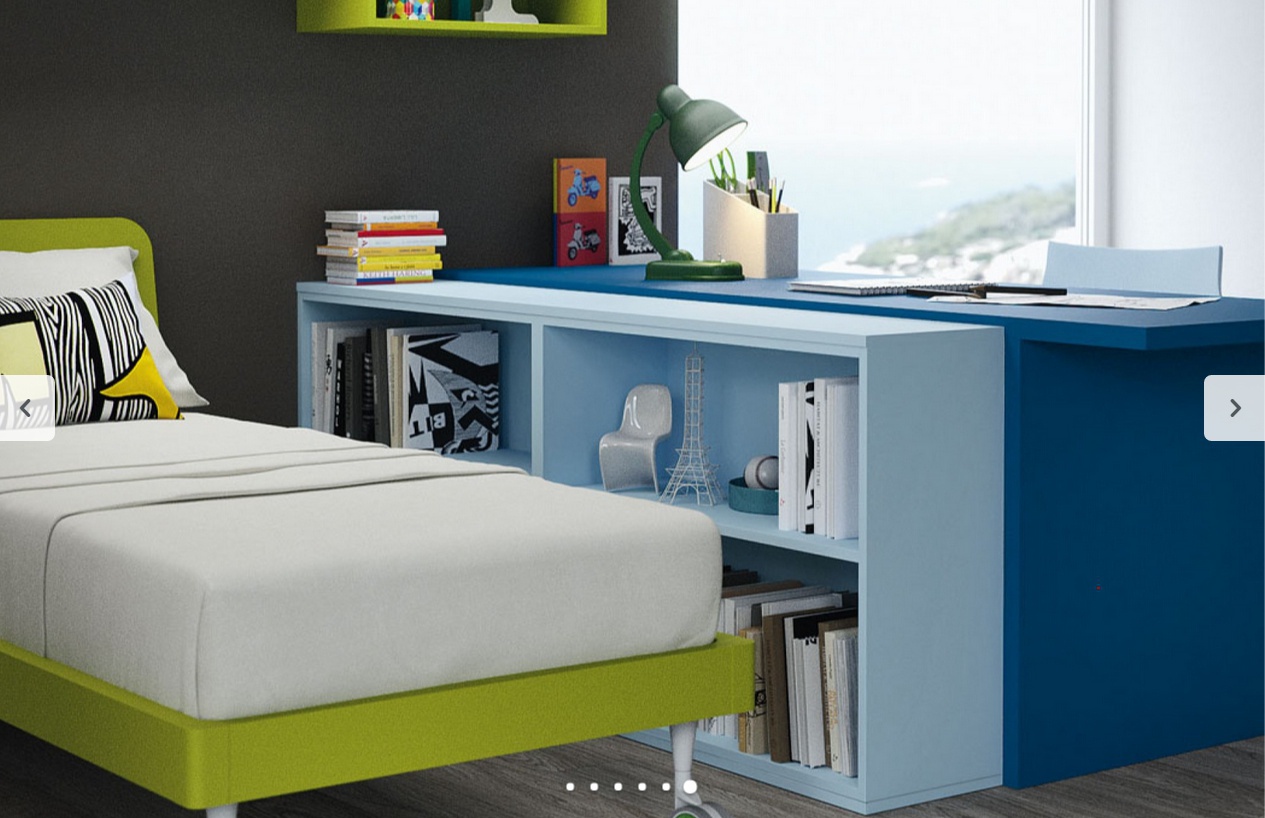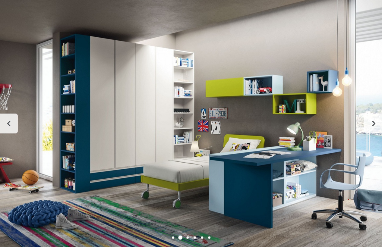 Children's room (Suite for children) Tag 14-03 from the Italian manufacturer Siloma in a modern style. Bright and spacious children, as well as incredibly functional. The set includes a bed on wheels, a large Desk, wardrobe, bedside tables, shelves. Colors of Your choice in stock.