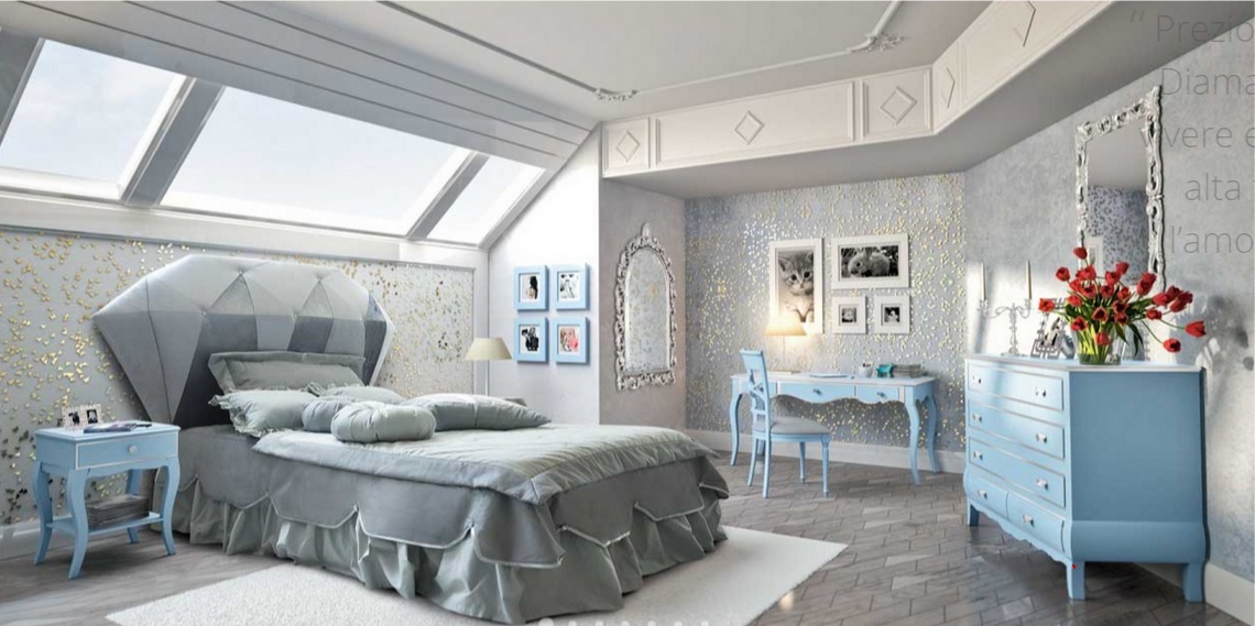 Children's room (Suite for children) Diamante from the Italian manufacturer Siloma in a classic style. The original headboard in the form of the stone - diamond. The set includes a bed with upholstered headboard, chest of drawers, bedside table, Desk and chair. Color to be selected from manufacturer's catalogue.