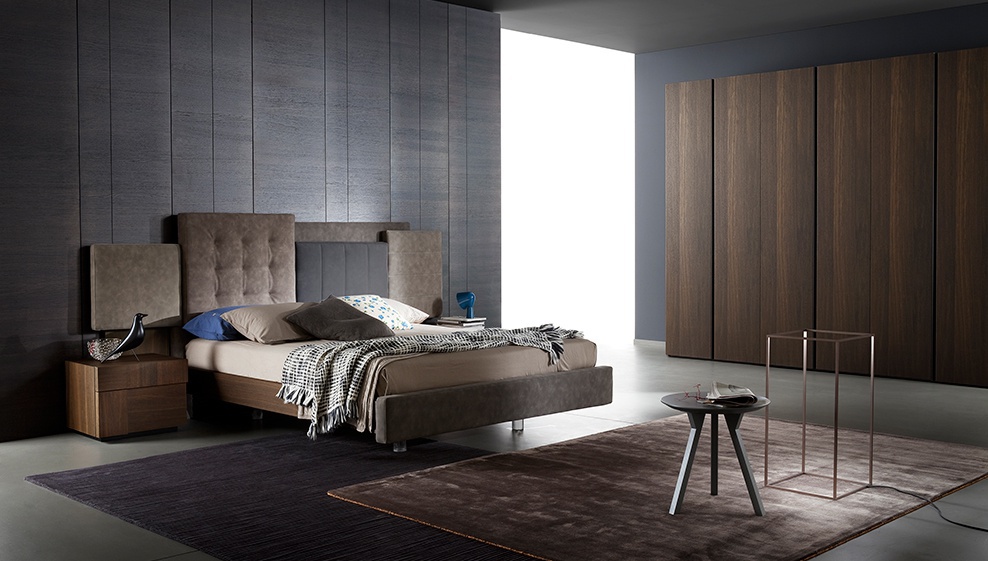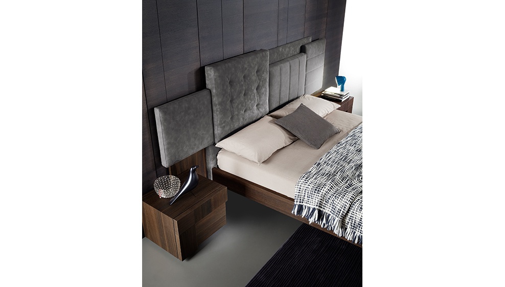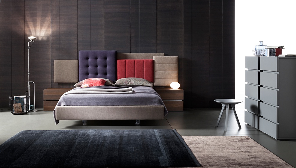 Creative Patchwork double bed from Italian furniture manufacturer Rossetto Armobil with upholstered headboard and footboard. The headboard is characterized by soft cushions, in the form of scraps of fabric differing from each other in color,size and stitch. Trim, side bars and bed frame headboard - decorative coating imitating oak veneer. The Patchwork model is available with container for the linen. Patchwork bed will surely please those looking for an original approach to creating interior bedroom.
