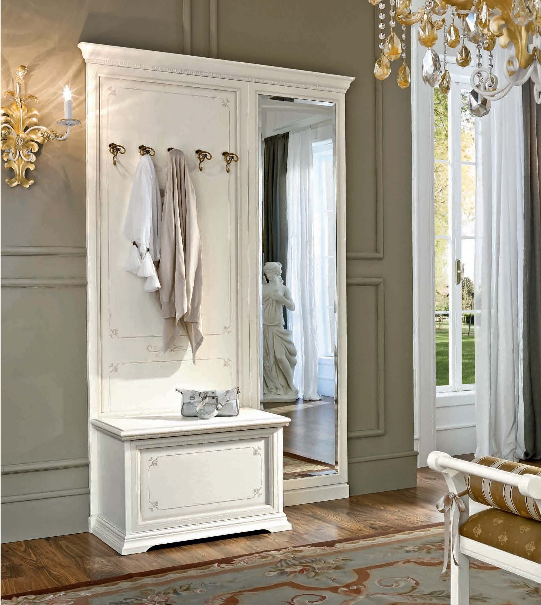 Hanger Afrodita from the Italian manufacturer Maronese. The frame is made of wood. The coat rack has five decorative hooks, Cabinet and large mirror. An excellent option with a decorative pattern will decorate Your entryway in classic style.