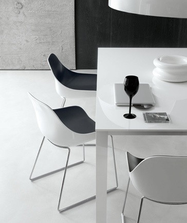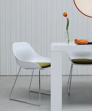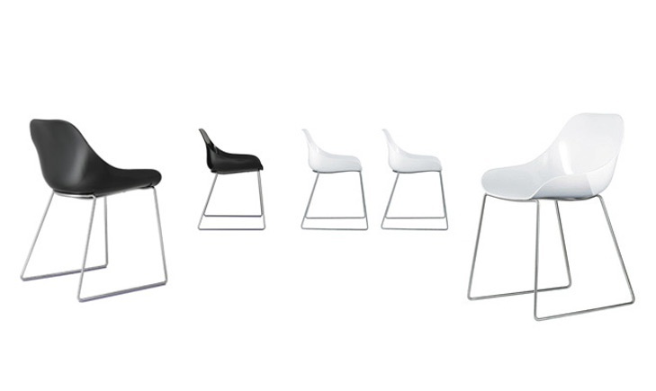 Chair on a swivel base /legs on the skids, the frame - chrome steel, seat in white or in black . Available in leather or textile upholstery.