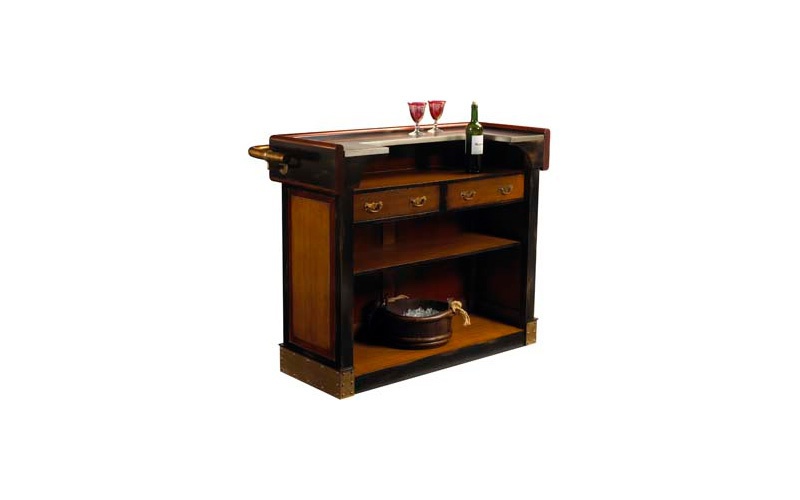 Stand Up bar de Bistro with a platform of brass from the American manufacturer French Heritage. The body is made of wood cherry and mahogany. Bar top made of granite. The back wall with drawers and shelves. The model is decorated with carved facade and varnished.