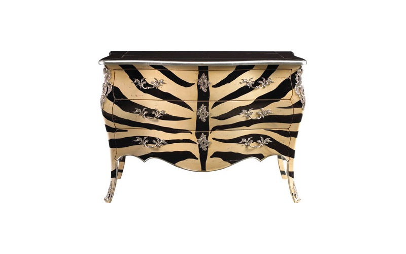 The Zebra chest of drawers with carved legs from an American manufacturer French Heritage. The frame is made of carved cherry wood. The surface is covered with a glossy lacquer black and white. Stick figure form from the metal. Model with drawers is notable for its capaciousness and strength. Zebra - French decorating idea. Perfect for eclectic interiors.
