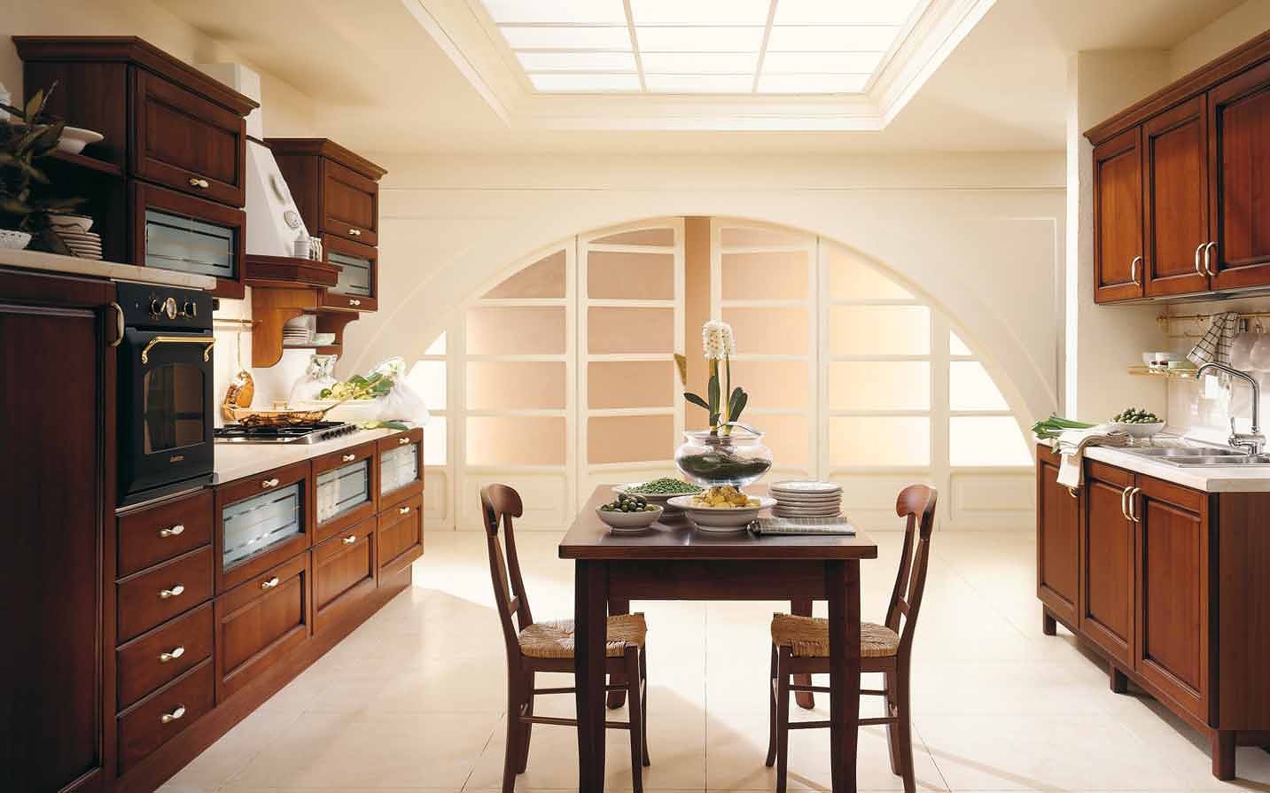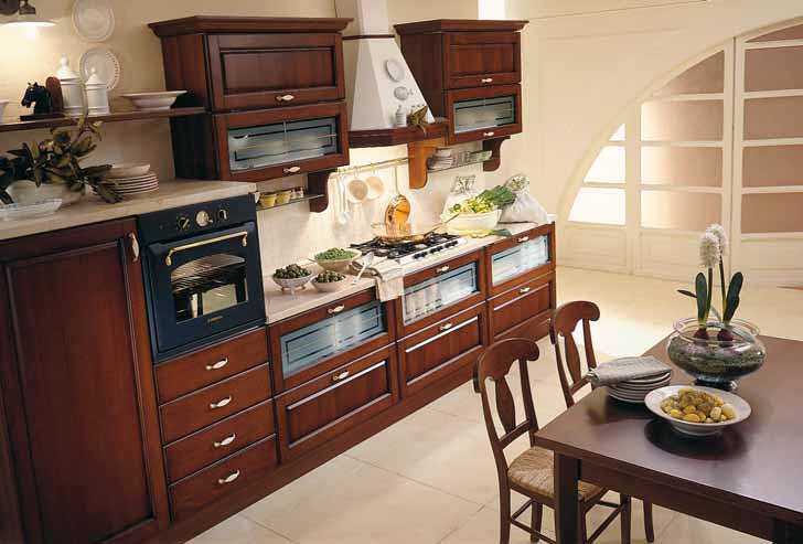 Kitchen (kitchen set) Golea from the Italian manufacturer Aran Cucine. The case is natural wood. Handles - metal. Glass sash. The model will perfectly complement the classic interior of the kitchen. Colours in stock.