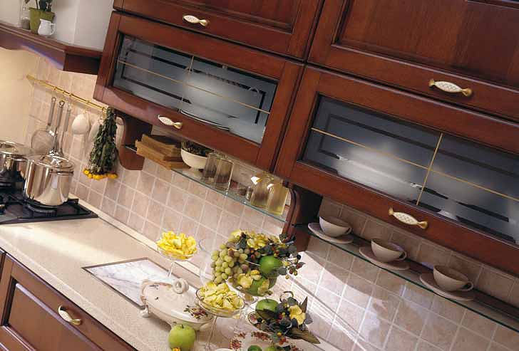 Kitchen (kitchen set) Golea from the Italian manufacturer Aran Cucine. The case is natural wood. The surface is covered with varnish. The model will perfectly complement the classic interior of the kitchen. Colours in stock.