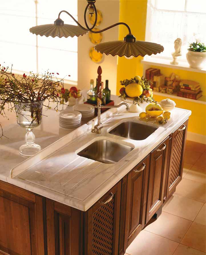 Kitchen (kitchen set) Provenzale from the Italian manufacturer Aran Cucine. The case is natural wood. Finish lacquered. Countertop - marble. Handles - metal. The model is made in classic style. Colours in stock.