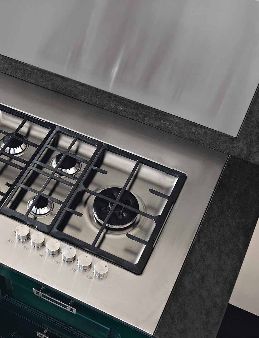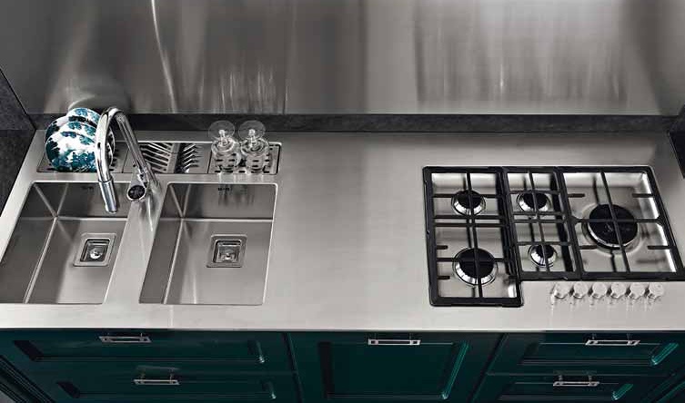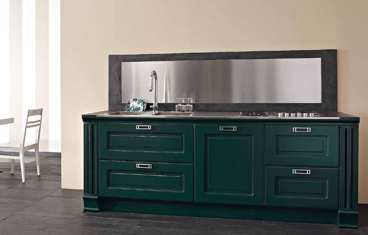 Kitchen (kitchen set) Bohemian from the Italian manufacturer Aran Cucine. Professional unit, lacquered doors colour green tundra, the surface of stainless steel with integrated sink and hob. The model is made in classic style.
