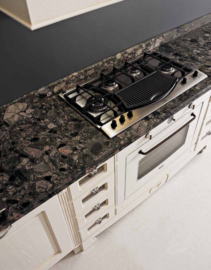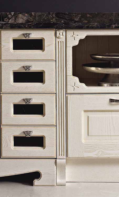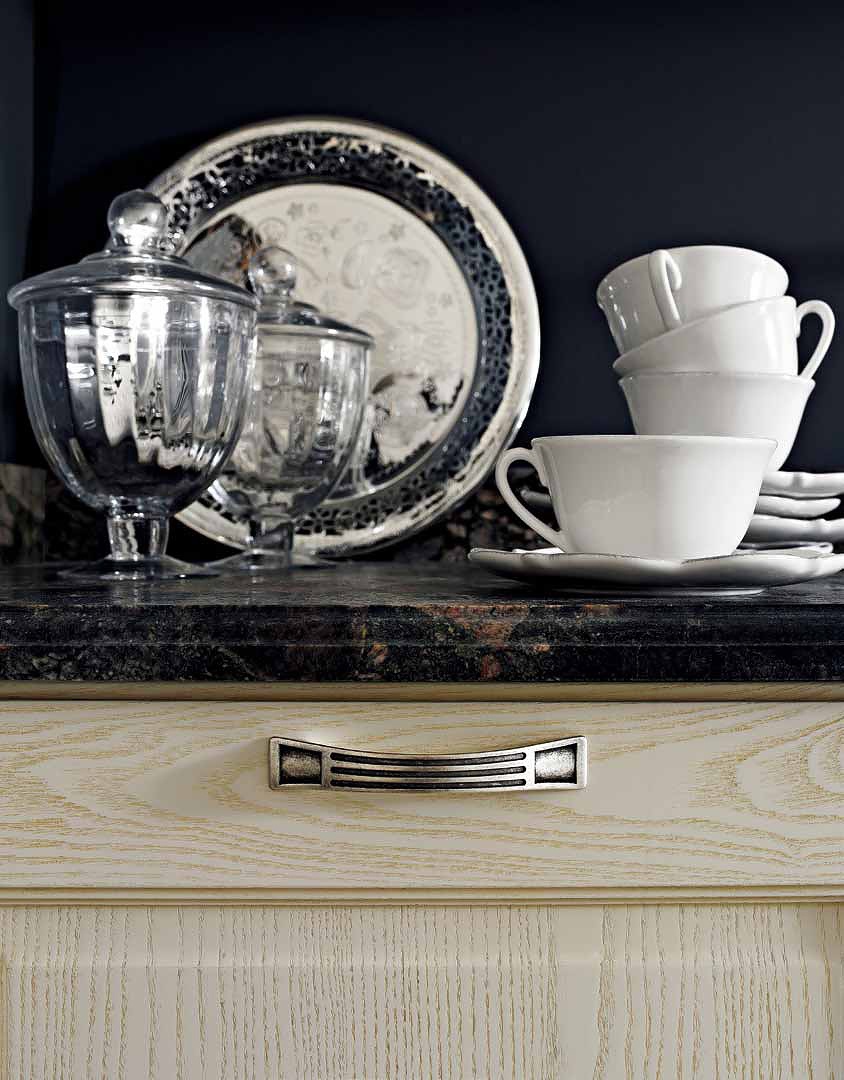 Kitchen (kitchen set) Charme from the Italian manufacturer Aran Cucine. Decipheronly ash body in brush finish. Color ivory, handle in aged silver, the surface of natural granite. The model is made in classic style.