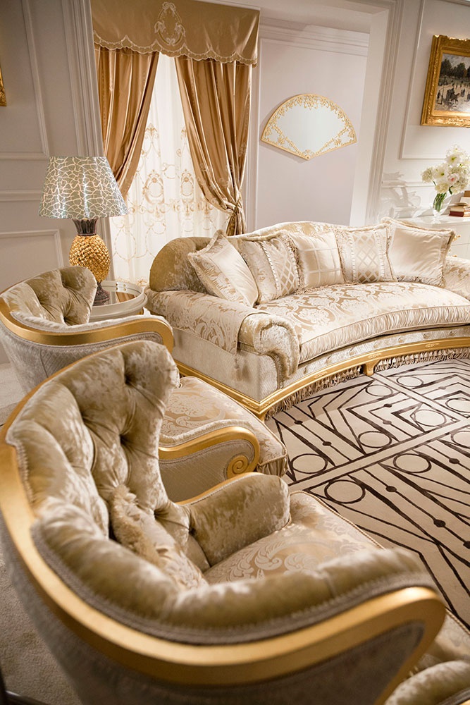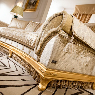 Sofa set e Valeria Cristina Italian manufacturer Keoma Salotti. The presented model three-seater sofa, armchairs and pouf. The furniture is made on a frame of fir wood and plywood with inlays of beech. The covers are partially removable. The removable filler cushions in goose down. Finishing is possible in the version with fringe and decorative cord. The kit can be ordered sofa beds. The classical solution for the interior of the living room.