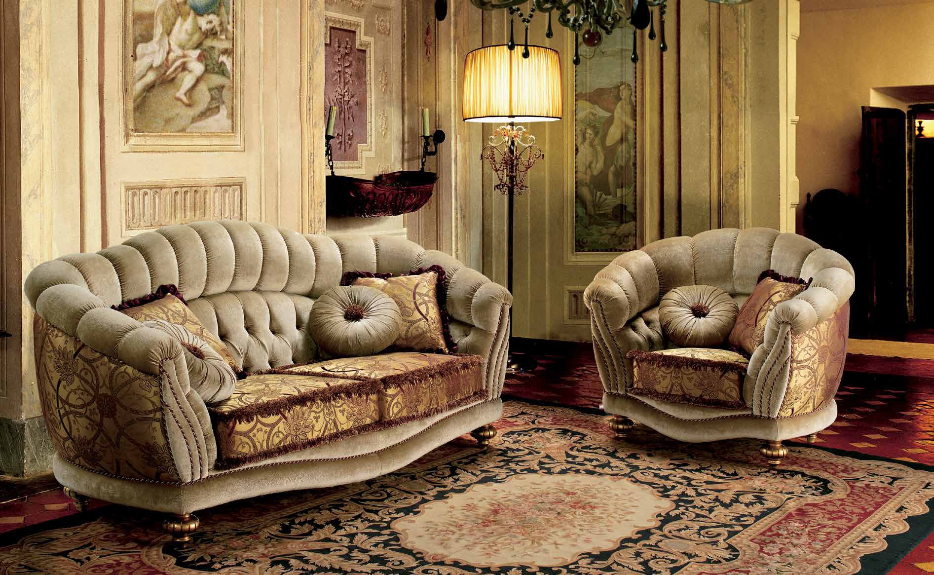 Double sofa Lucilla from the Italian manufacturer SAT Export. The frame is natural wood. Upholstery - textiles. Legs are decorated with hand-carved. The model is made in classic style, combines tradition and design.