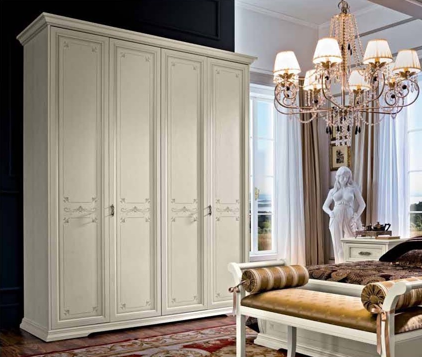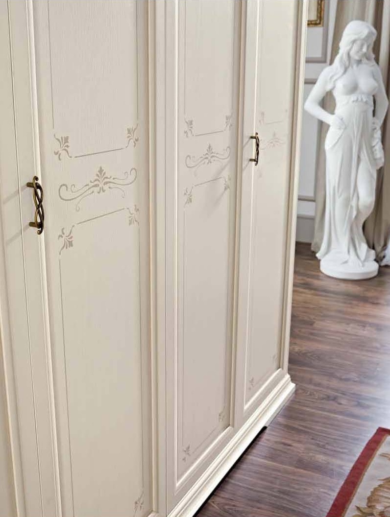 Wardrobe Afrodita from the Italian manufacturer Maronese. Classic style. Frame - wood. Colors in the catalog. The model has four doors: two mirror and two wooden. There's also a model without a mirror. Included are two removable shelves and three brackets for the hangers. The facade is decorated with a decorative pattern. A great choice for the bedroom.