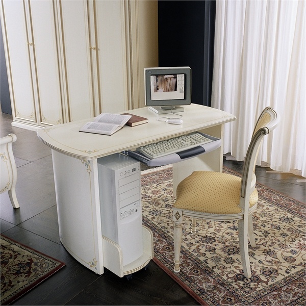 Computer Desk Scrivania from the Italian manufacturer Pellegatta. The model is handmade. There is a sliding keyboard shelf and a mobile stand under the system unit. Material tamburino which is a plate with honeycomb on the basis of solid spruce. Wood manually painted in any color from the catalog company. Using only hand decoration painted in the technique of miniatures. For painting is tempera 6-8 colors, a picture from a catalog or based on the customer's sketch. The surface is covered with a substance, which protects it from scratches and damages. It is proposed to Supplement the model with a chair of similar design. The series includes also a single bed, bedside table, wardrobe.