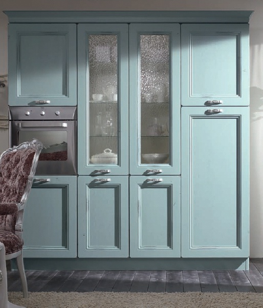 Facades and side walls with veneer walnut color -Azzurro. Factory offers other colors: Bianco, Avorio, Rosso, Verde, Viola, Nero. Matte glass in wooden frame. Accessories s color - bronze or silver.