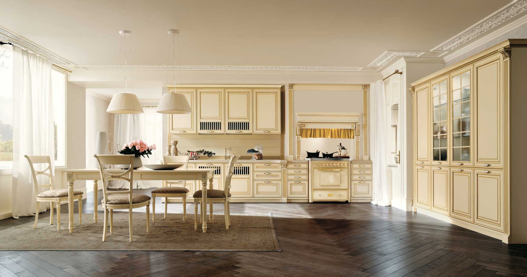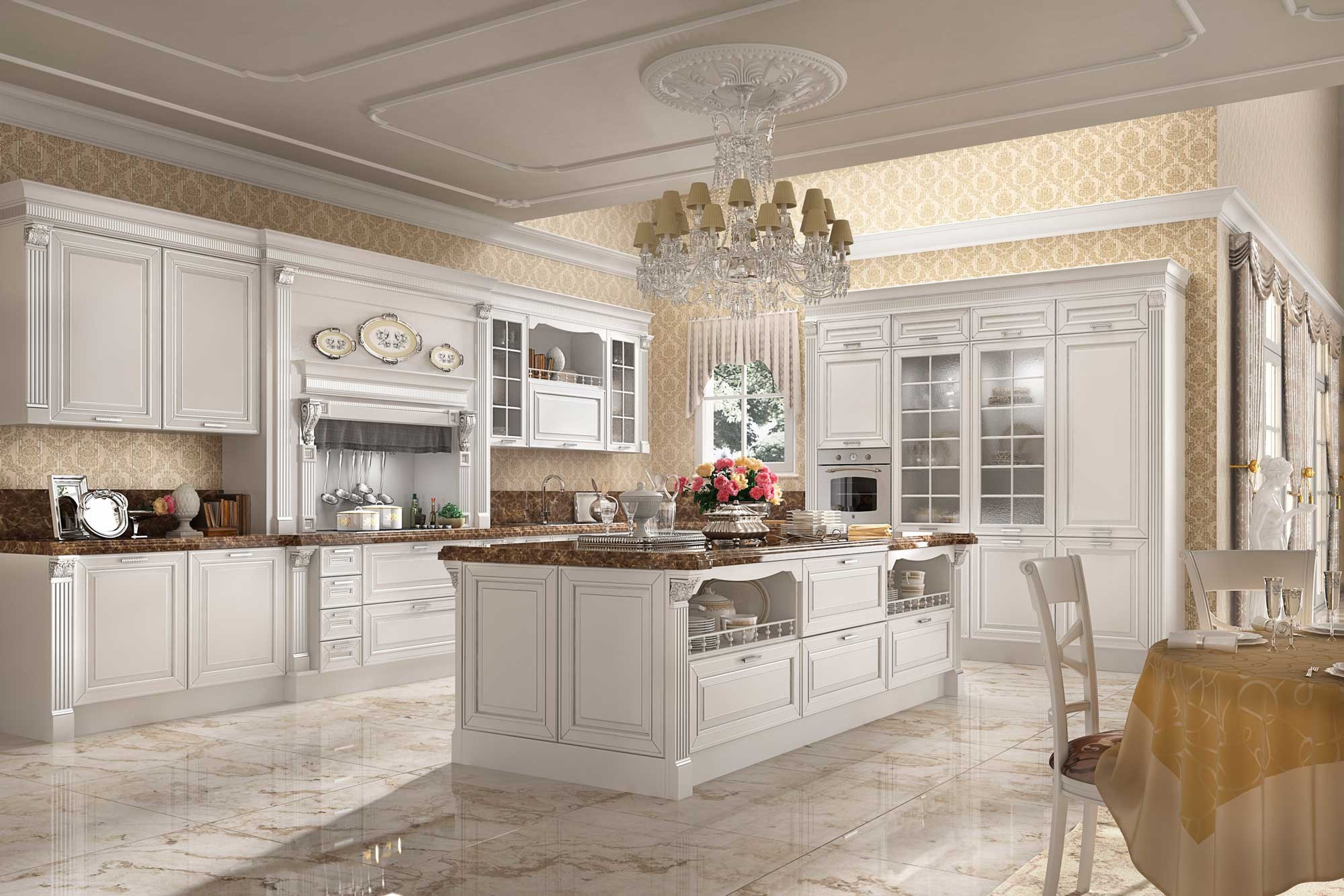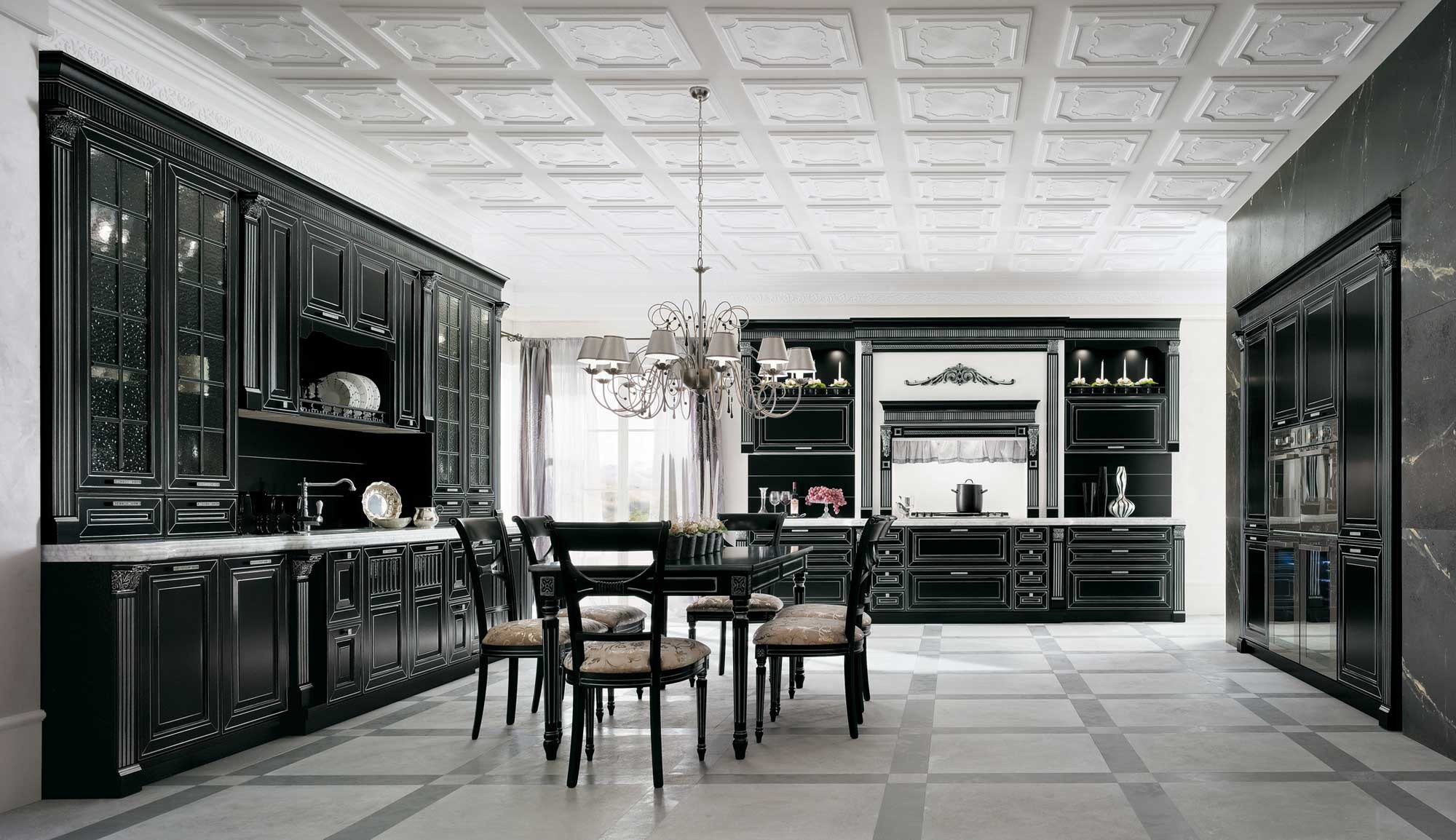 Kitchen (kitchen set) Opera Luxury from the Italian manufacturer Siloma in a classic style. U-shaped kitchen design with Central gantry hood. The variety of elements, finishes, carvings give this kitchen charm and status. As great a variety of finishes in colour from white to black, with gold-plated and silver-plated elements.