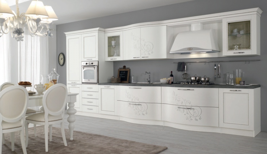 Decoration of facades, the side walls of MDF. The company's designers designed the cabinets with shaped rounded fronts. The decoration of the facades is a decorative pattern and shiny chrome handles. Translucent glass in a wooden frame.