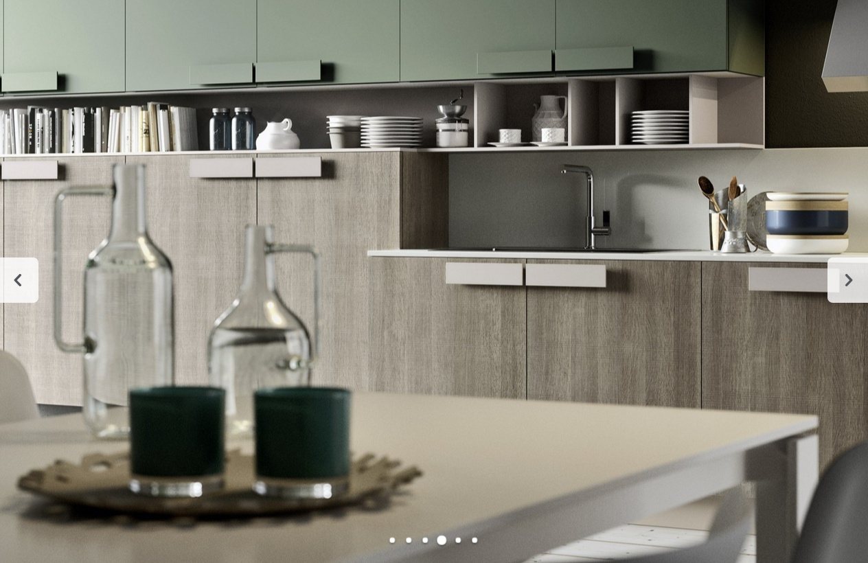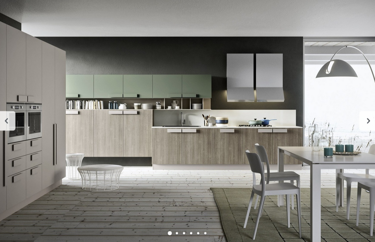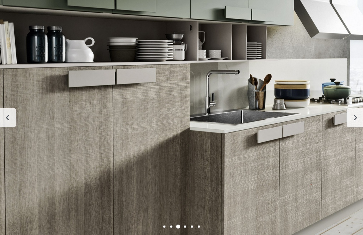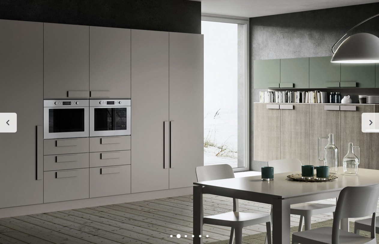 Kitchen (kitchen set) K 4 One Handle from the Italian manufacturer Siloma in a modern style. Functional and compact kitchen model. A separate block housed columns and columns of cabinets for built-in appliances. Wide choice of size and color number back in stock