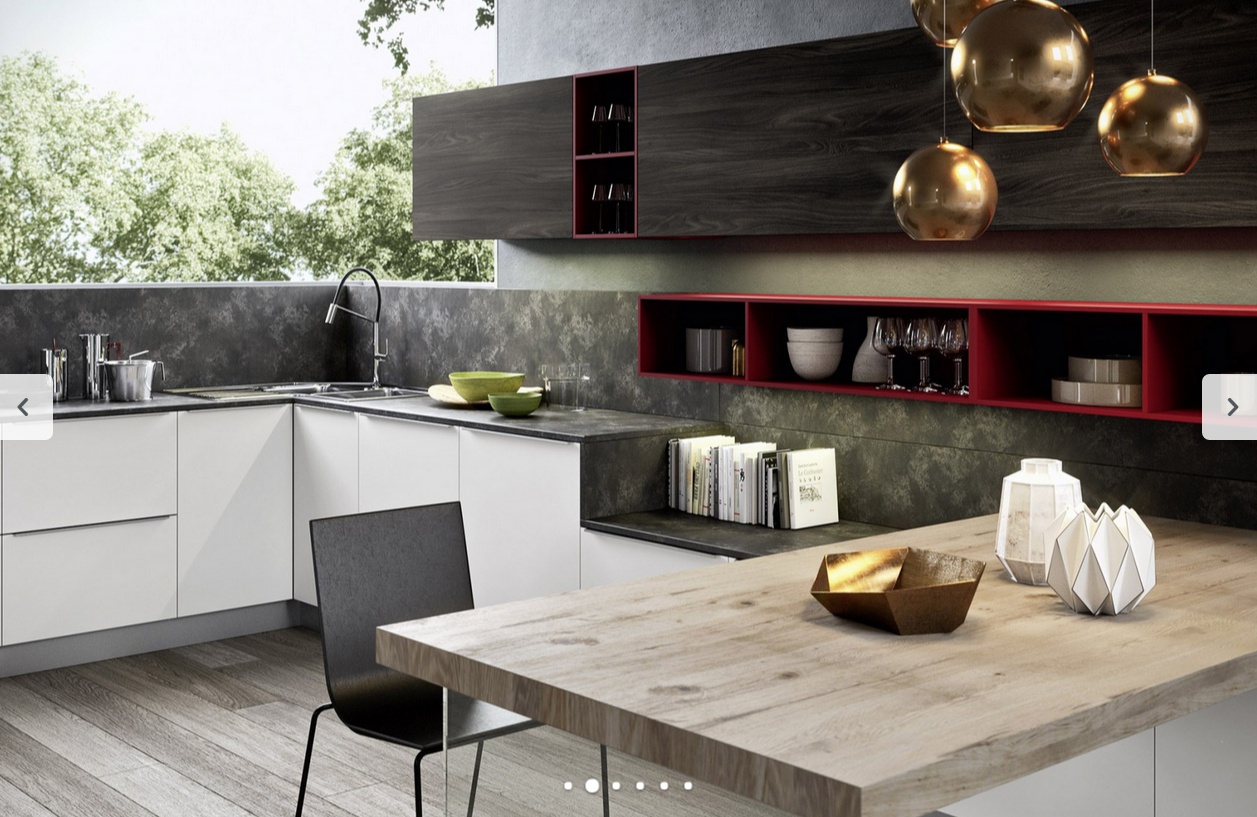 Kitchen (kitchen set) One Linear 4 K from the Italian manufacturer Siloma in a modern style. Spacious, almost weighty kitchen due to the transparent supports of the dining table and the white finish of the lower cabinets. The original combination of finishes of red and dark oak. That activate a separate block with columns for built-in appliances.