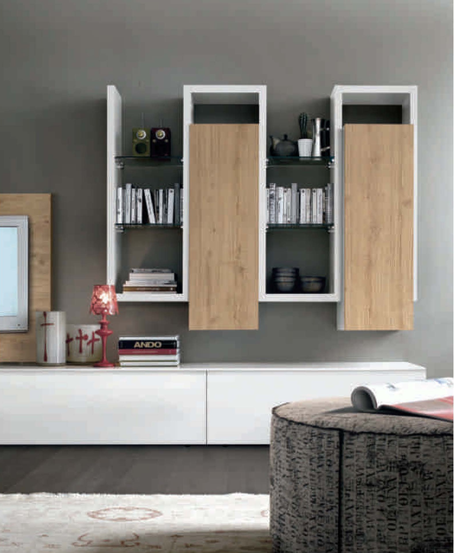 Modular system Seta from the Italian manufacturer Maronese. The system consists of shelves, of cabinets, long cabinets and wall panels for TV. The model is made in modern style, made of wood. Colours in stock. Delicate and compact modular system will fit perfectly into any interior.