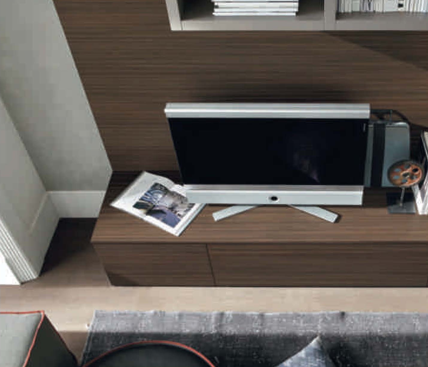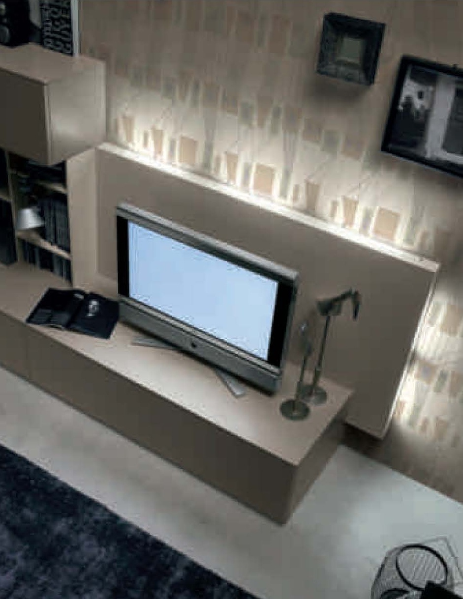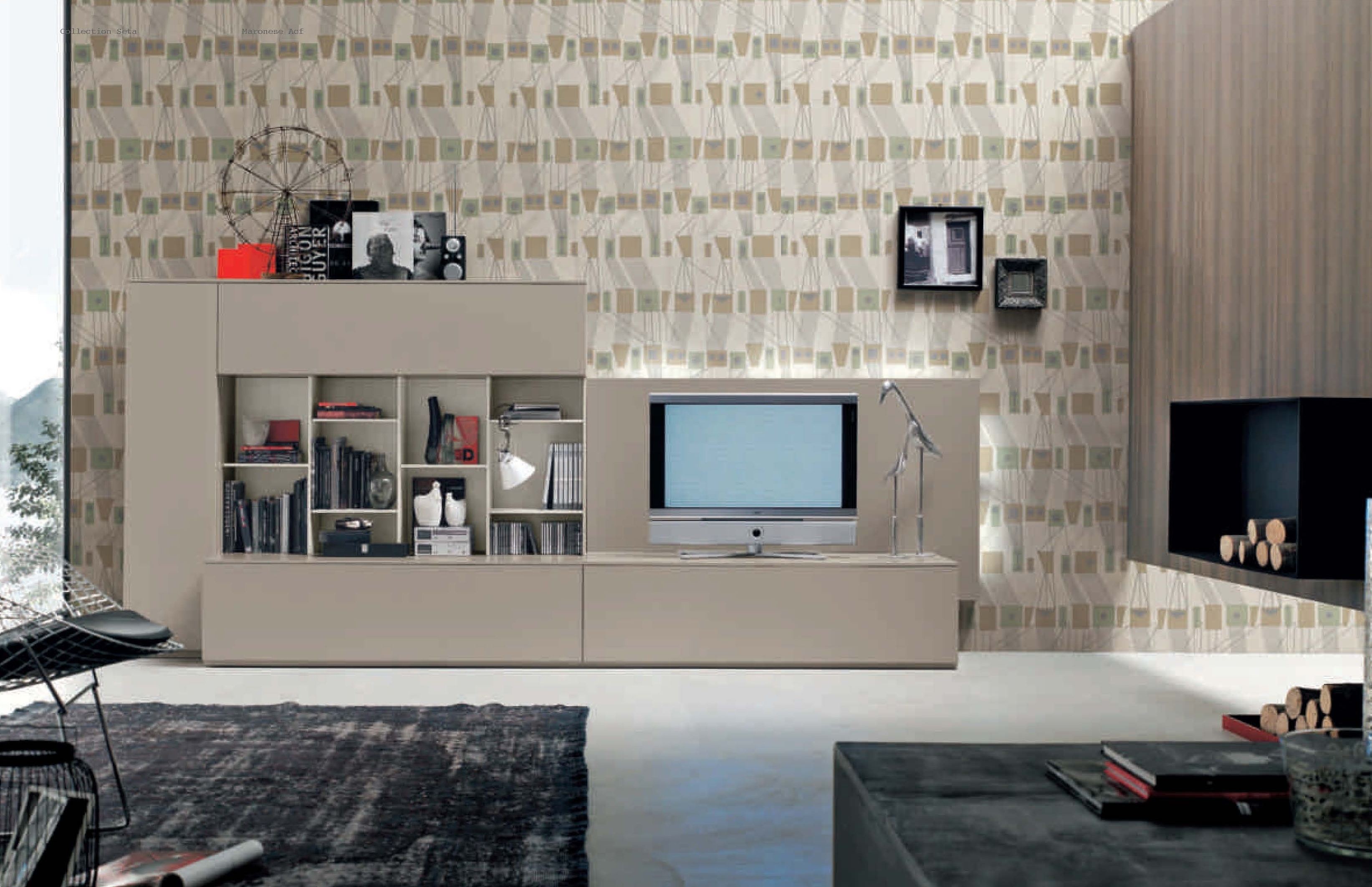 Modular system Seta from the Italian manufacturer Maronese. The modern composition made of wood. The system consists of open compartments of cabinets, long cabinets and wall panels. Colours in stock. Perfect for a cozy living room.