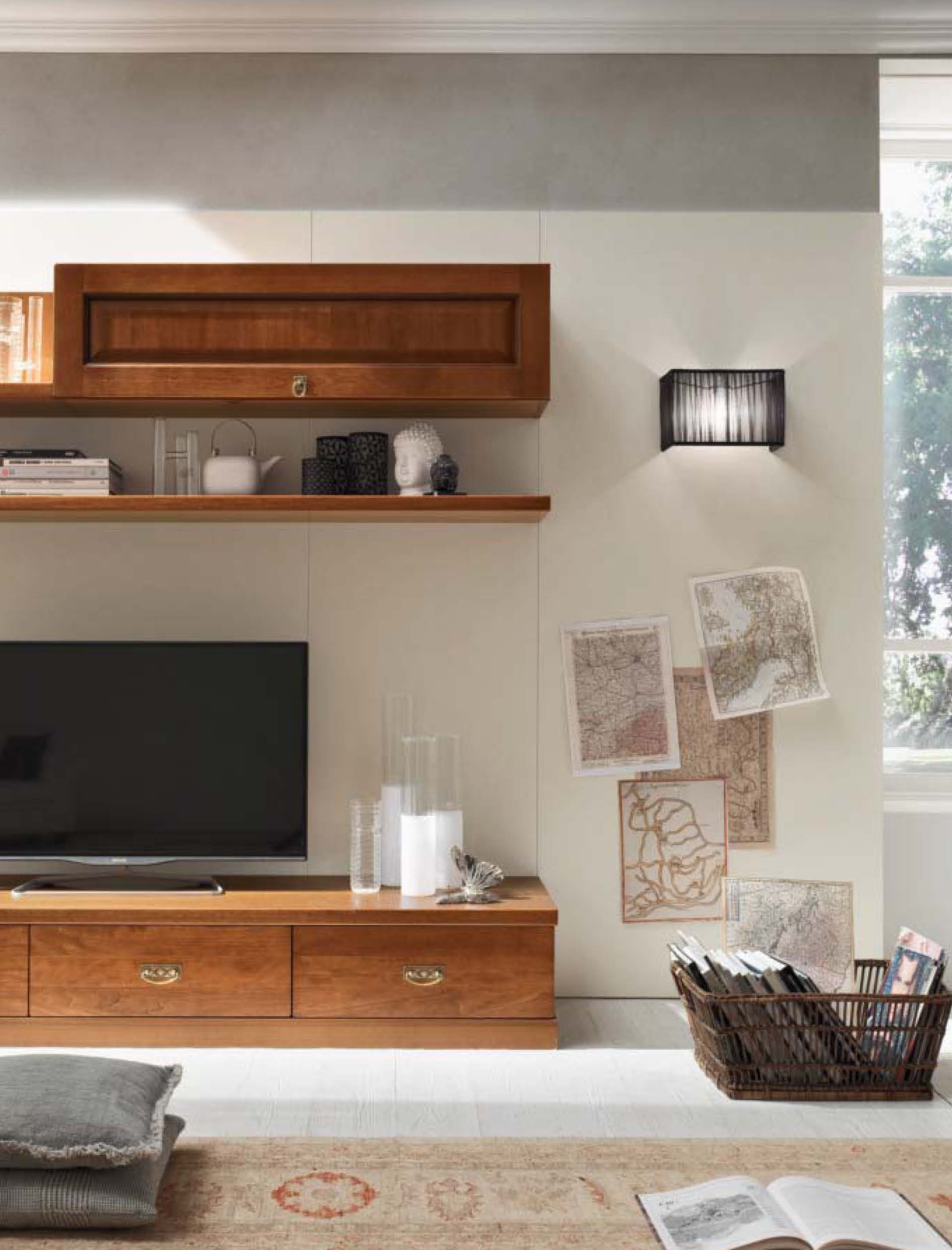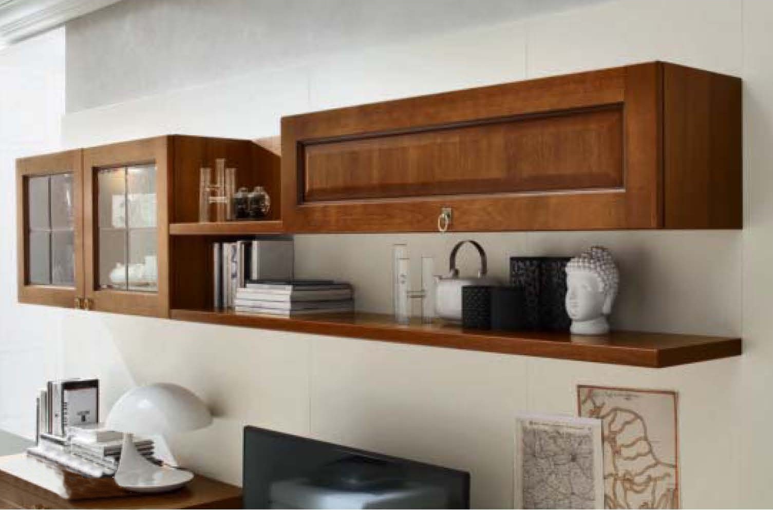 Asolana modular system from Italian manufacturer Maronese. The system is designed in classic style, wooden frame. The sculpture consists of open and closed shelves, wall display cases and high and low tables. Can be equipped with internal lighting. A perfect choice for a cozy living room.