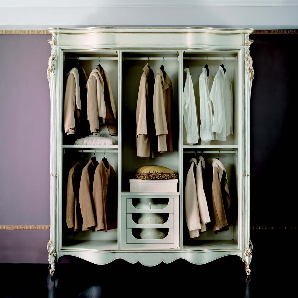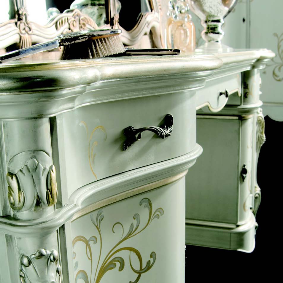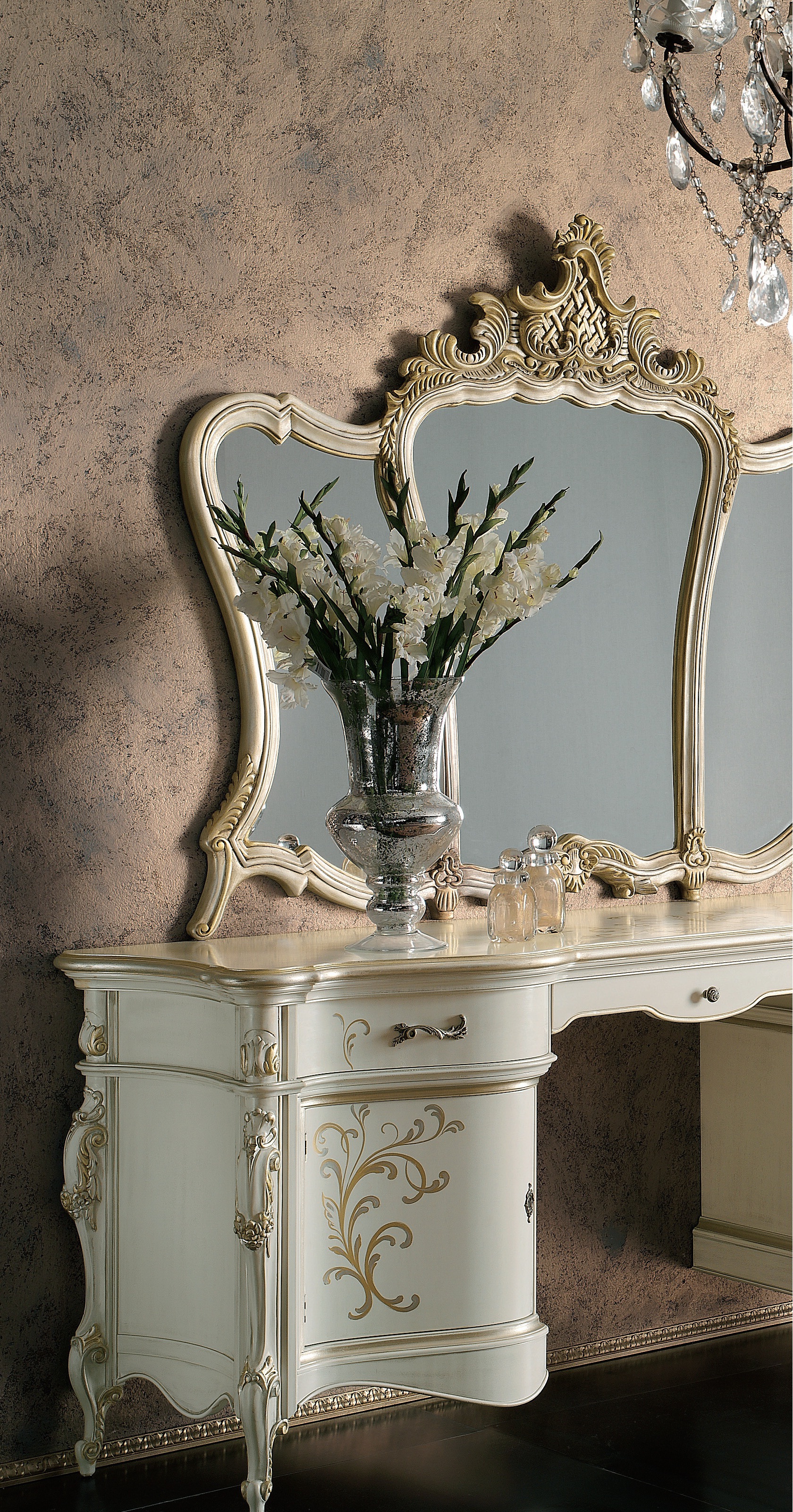 Headsets for bedrooms XXI Luigi from the Italian manufacturer Arve Style. This set includes: tricuspid wardrobe, dressing table on carved legs, a wall mirror in carved wood frame, the stool in upholstery textiles. Frame, base, frame products made from solid wood. Finishing - veneer, varnish from the range, including available matte white. Decorations are elaborately carved and painted with gold, silver. Set a refined, classic style with Baroque elements. Your bedroom will acquire individuality and elegance.