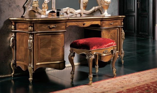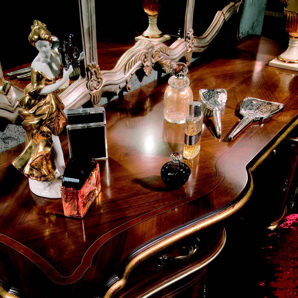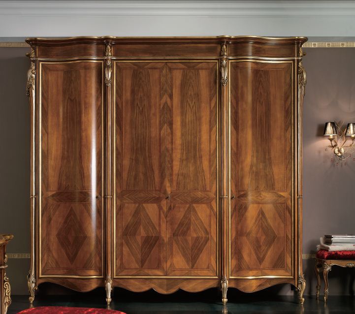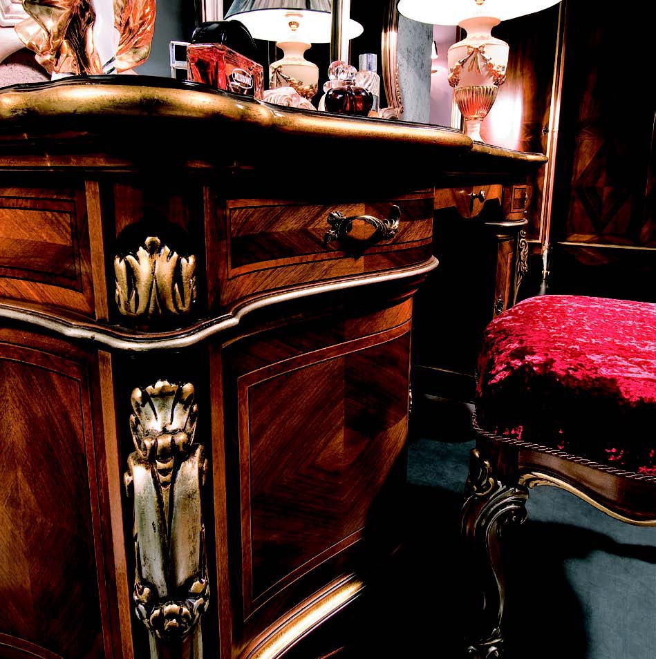 Headsets for bedrooms XXI Luigi from the Italian manufacturer Arve Style. This set includes: wardrobe 4 hinged, double bed with high headboard, bedside tables, chest of drawers, dressing table, wall mirror in carved wood frame, the stool in upholstery textiles. Frame, base, frame products made of solid wood. Finish - walnut. The wood fibres create a natural geometric pattern. Accessories metal, fine. Decorations are elaborately carved, inlaid, gilded. Set in classic style will fill your bedroom interior individuality and elegance.