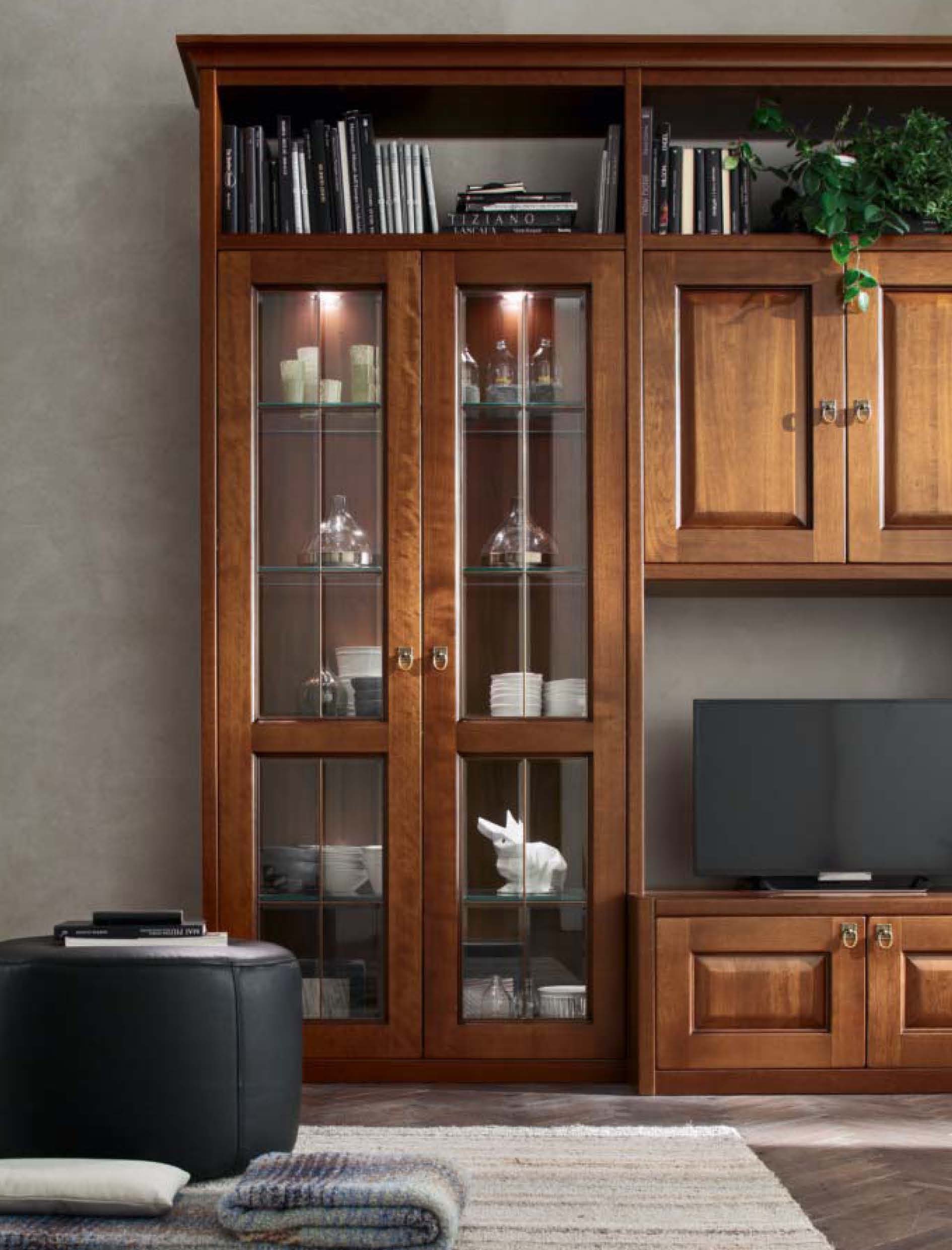 Asolana modular system from Italian manufacturer Maronese. The system consists of shelves, open compartments, display cases with internal lighting, drawers, lockers, cabinets and niches for your TV. The frame is made of wood. Composition Asolana, executed in classical style, will decorate any interior.