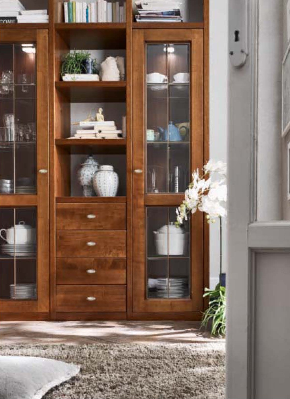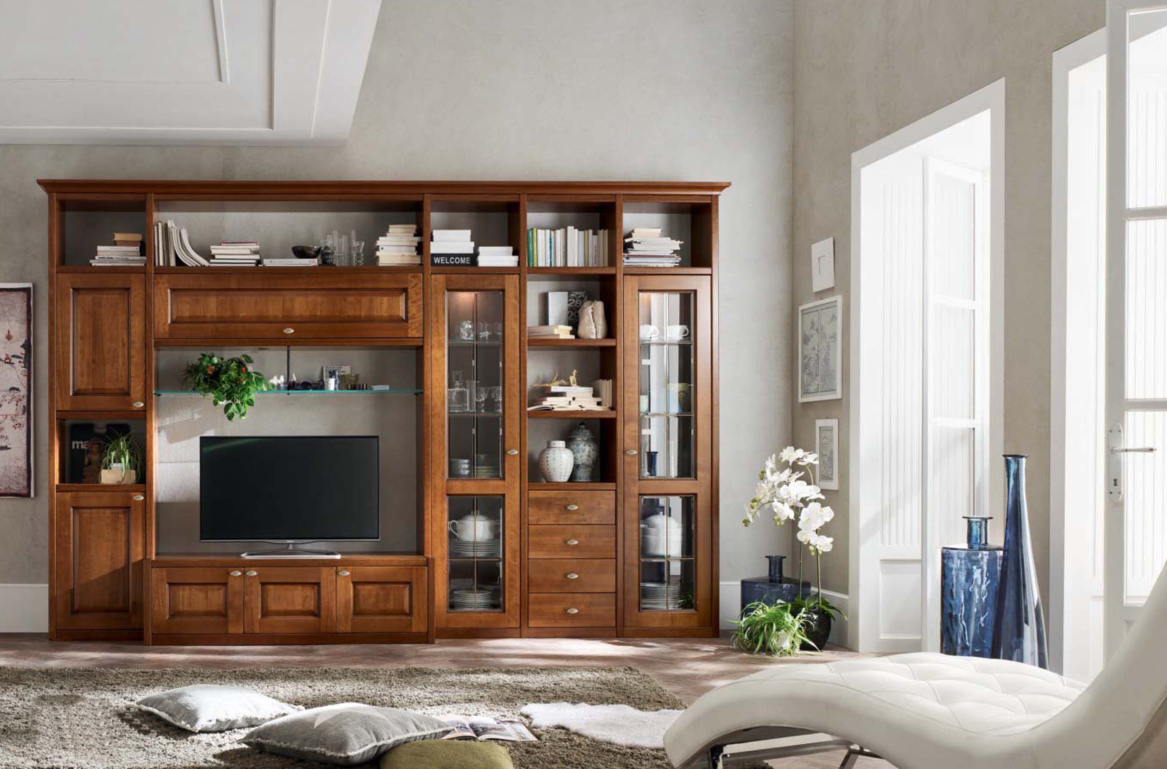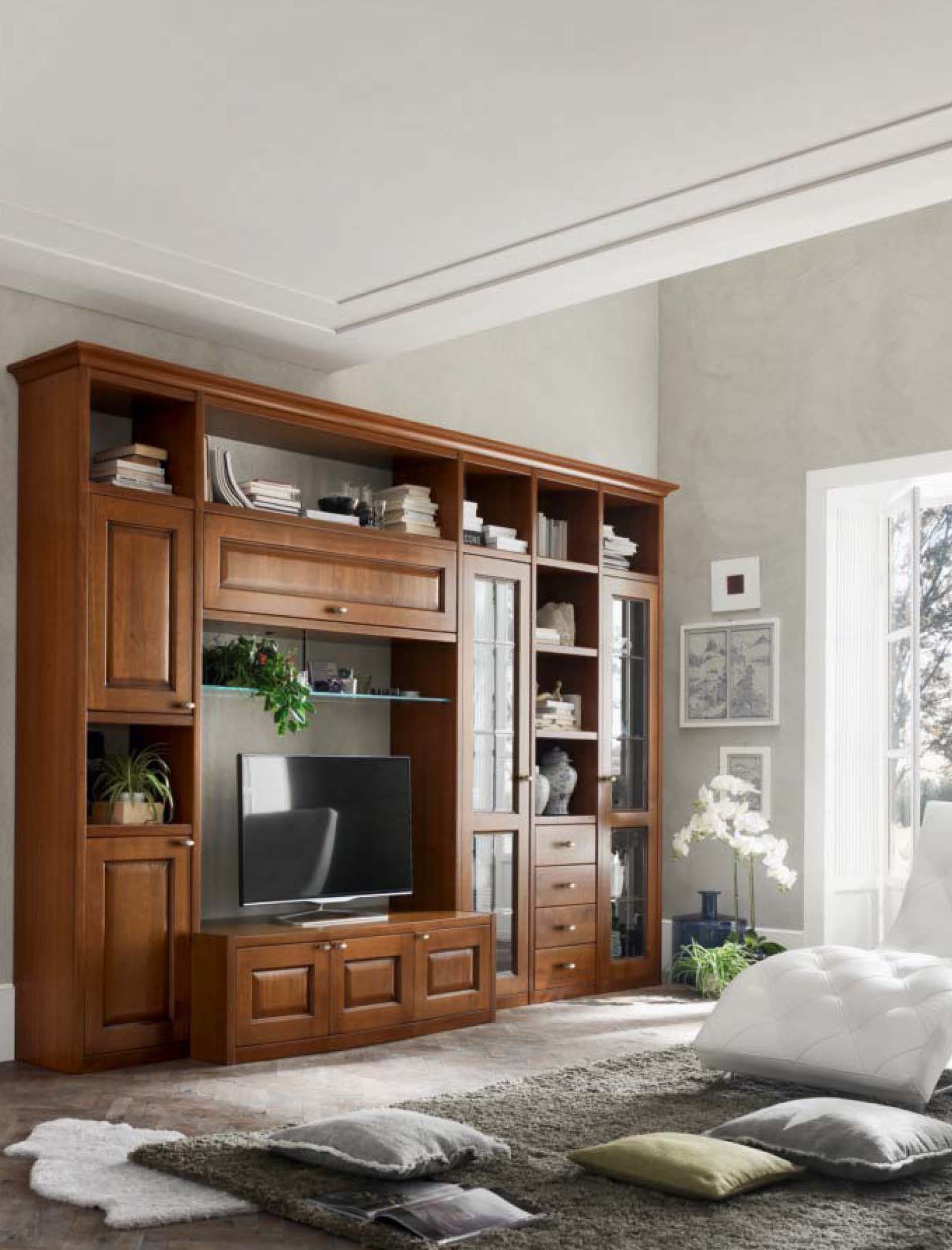 Asolana modular system from Italian manufacturer Maronese. System classic d?cor consists of shelves, open compartments, cabinets with internal lighting, drawers, lockers, cabinets and niches for your TV. Wooden frame and original design makes the composition ideal for a living room.