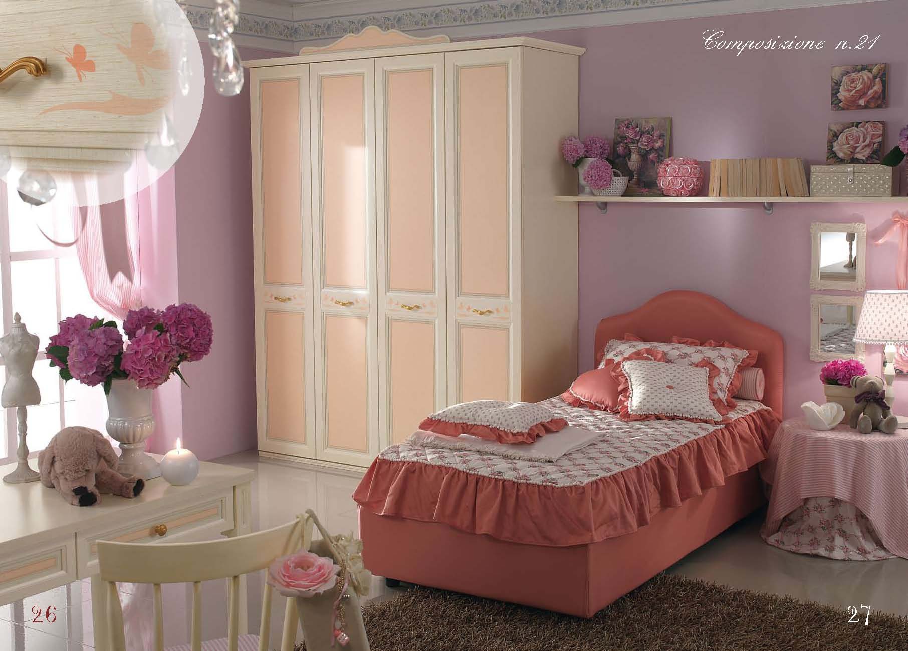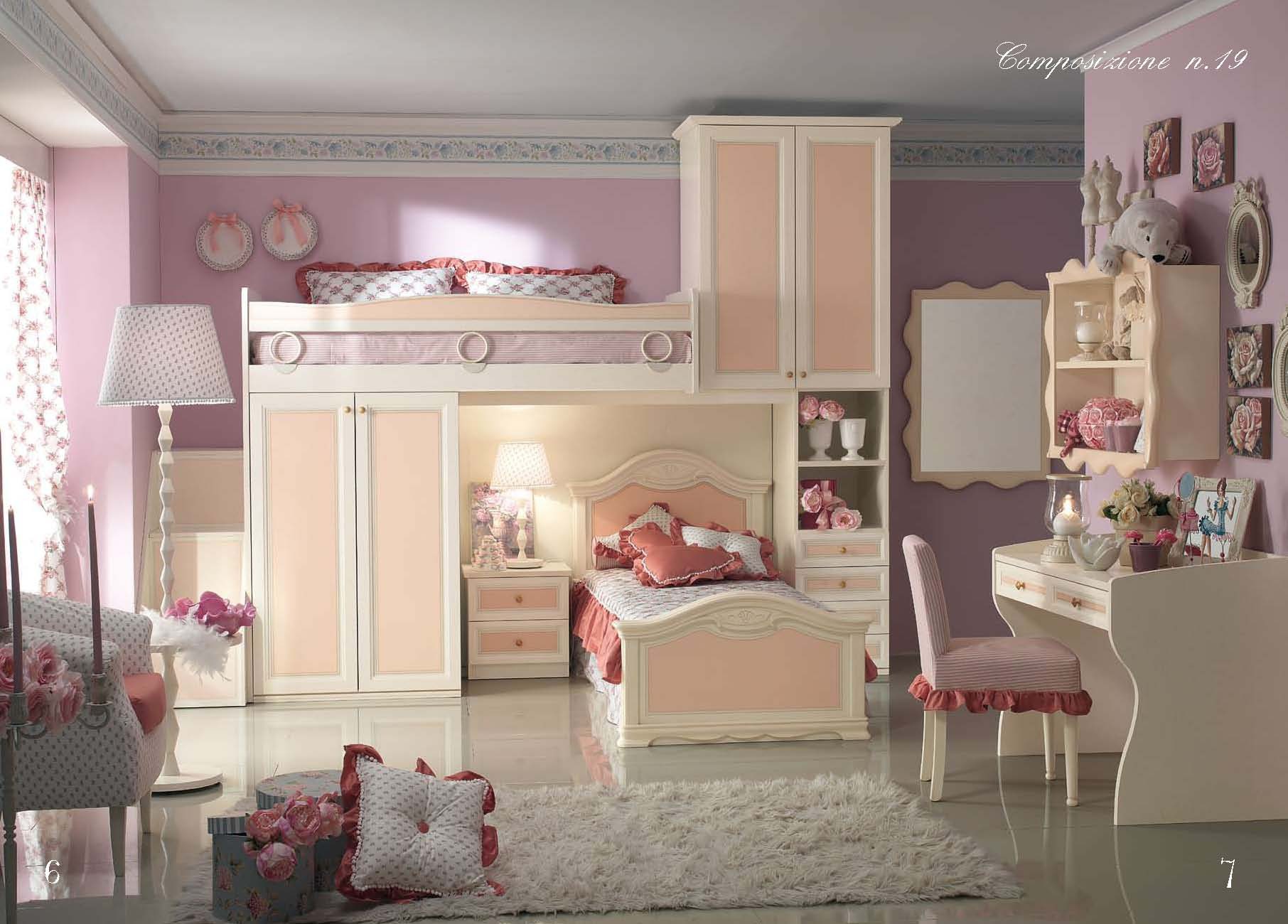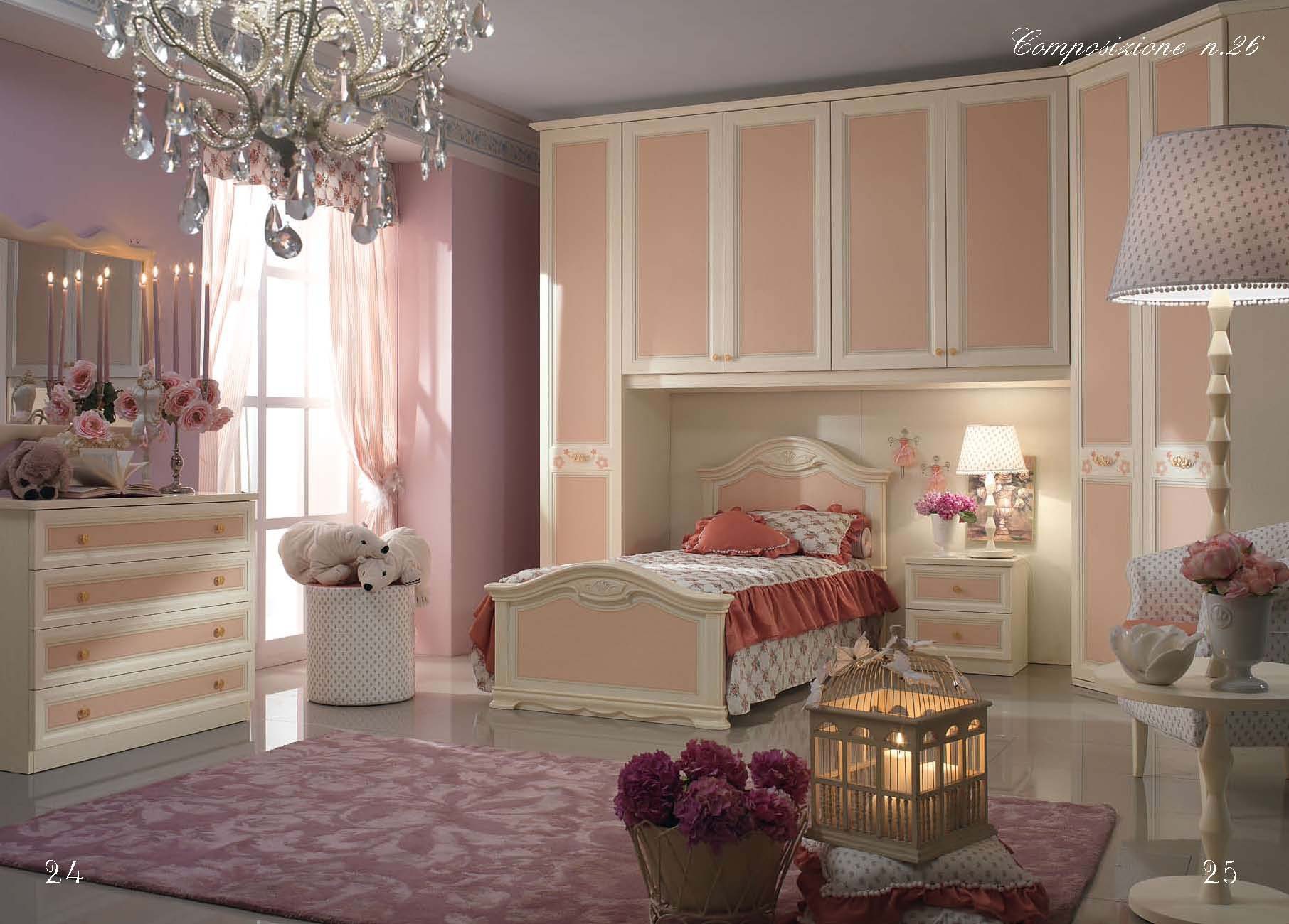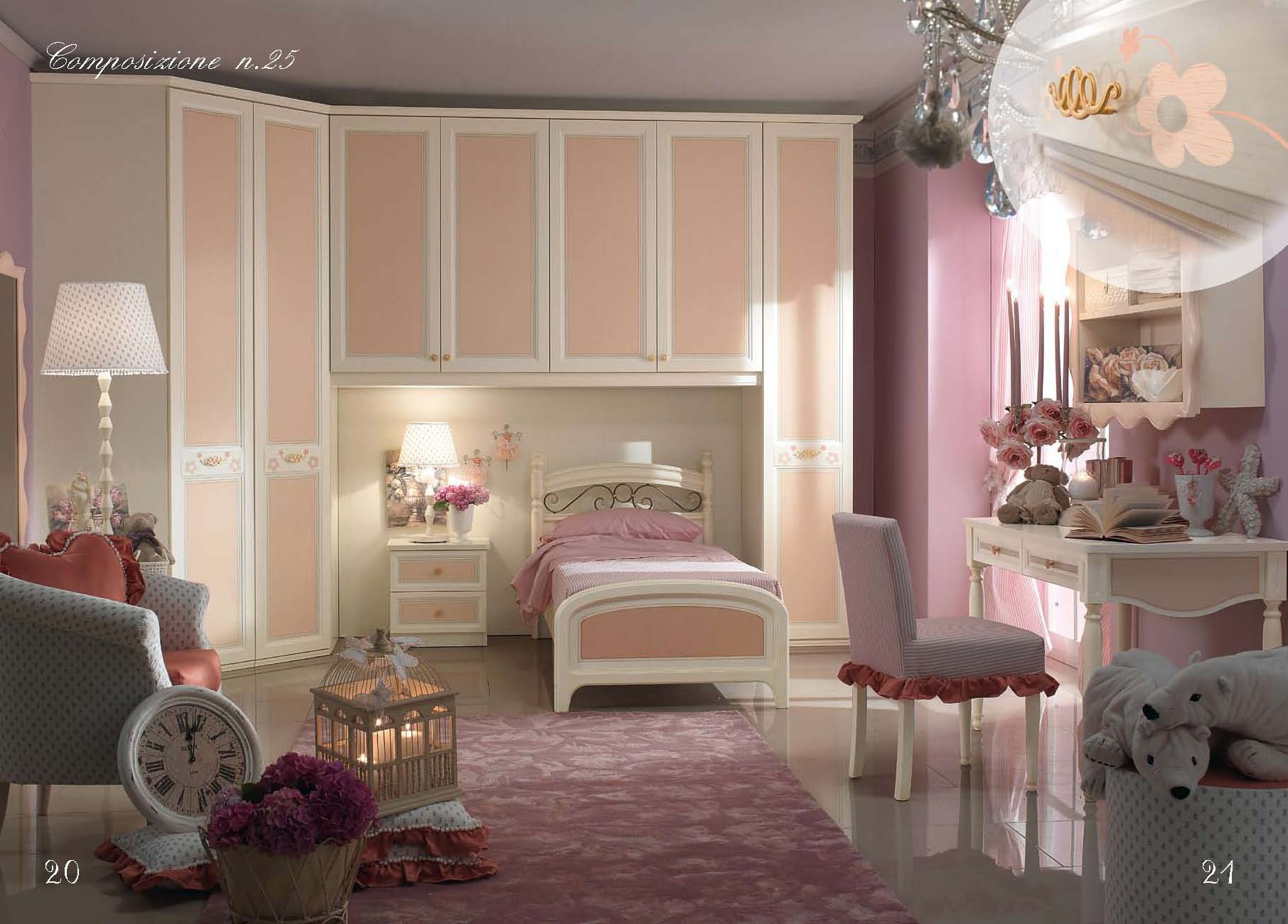 Children's room (Suite for children) Kocca Rosa from the Italian manufacturer Imab Group in classic style. Gentle children for girls in peach and ivory. The composition consists of cabinets, beds, desks, open shelves, mirrors. Also, there are different variations in size and layout to suit Your taste.