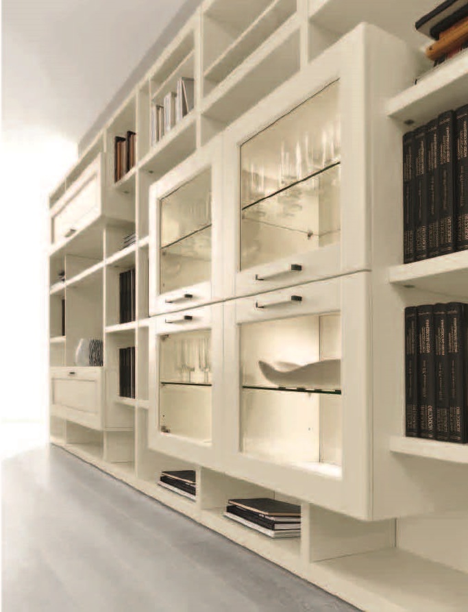 The modular system of the Piave from the Italian manufacturer Maronese. Classical system made of wood. The composition consists of four small display cases with internal lighting, plenty of open compartments and closed shelves. Colours in stock. A great option for those who love books or display your favorite things.