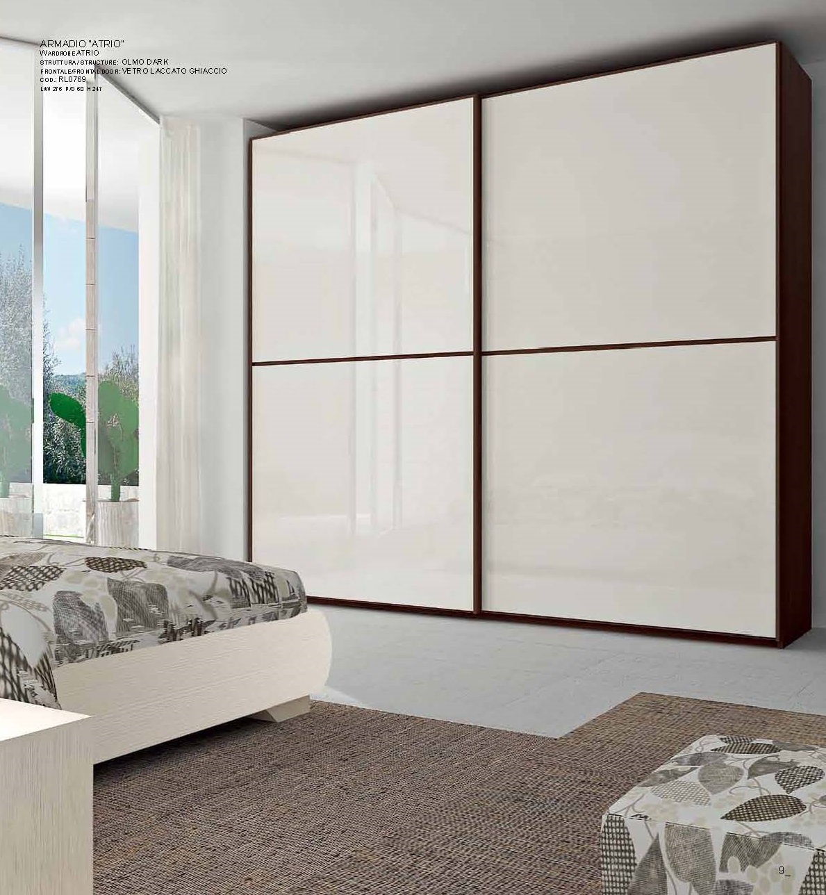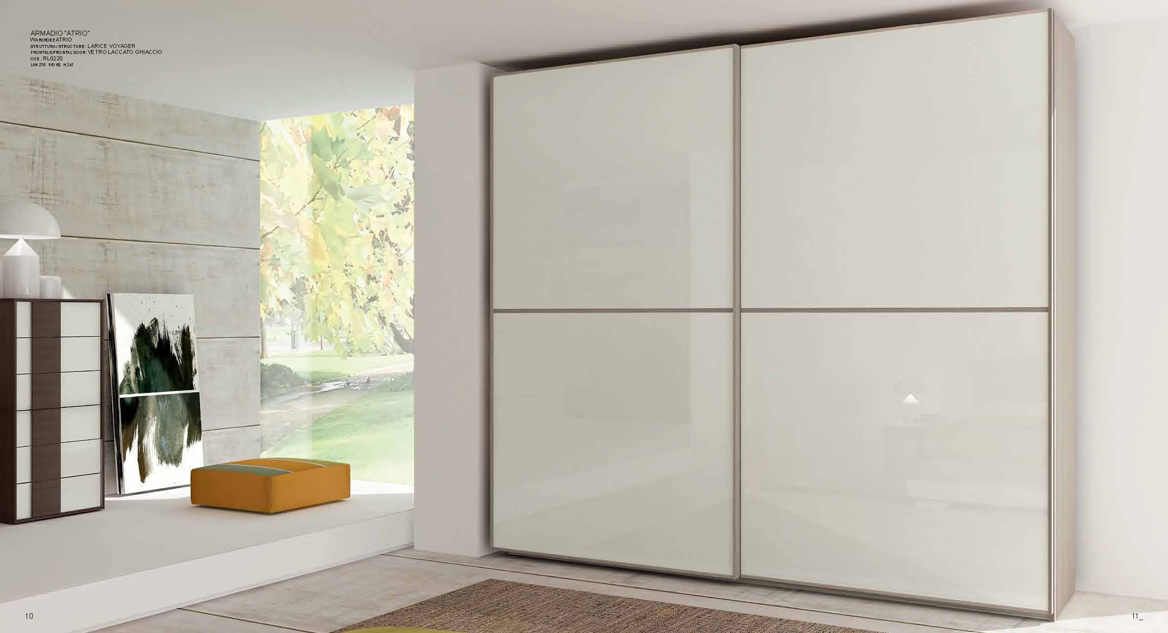 Cabinet Atrio from the Italian manufacturer Imab Group in a modern style. A large and spacious wardrobe with sliding doors made of painted glass. A wide range of frame finishes and colours for the decoration of doors.