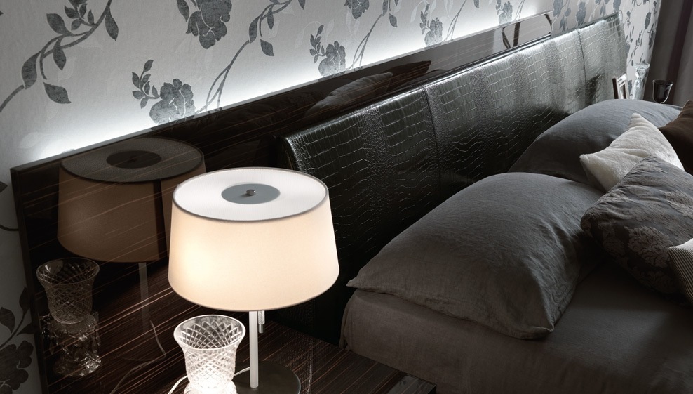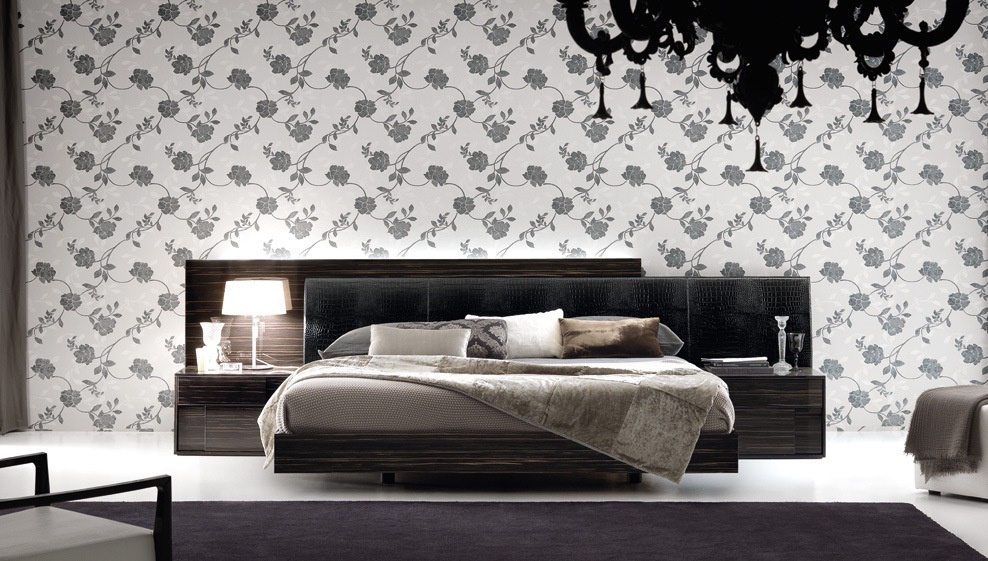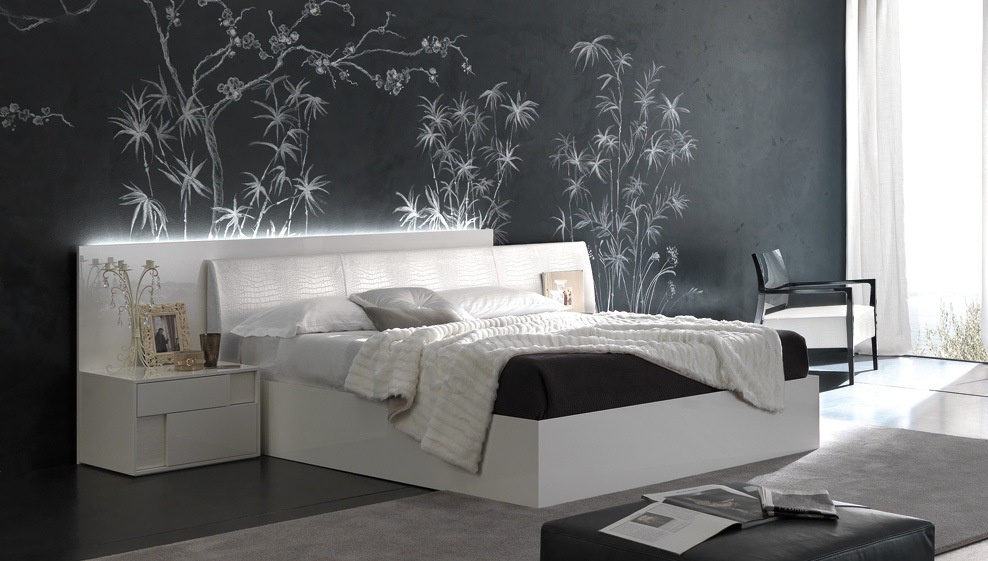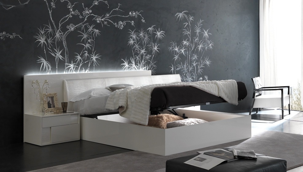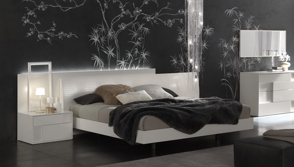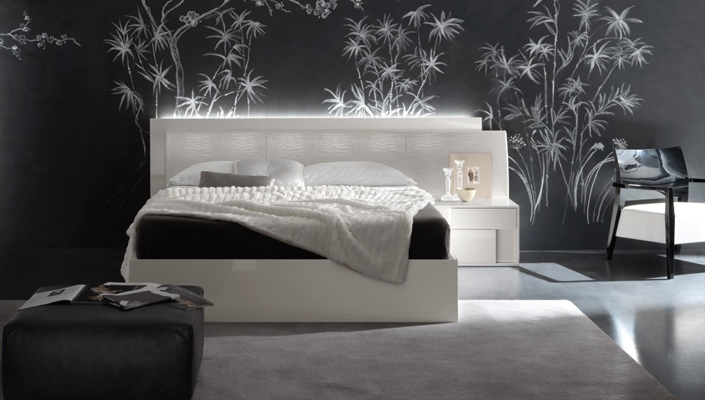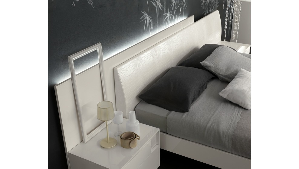 Double bed Nightfly, a collection of Luxury, Italian furniture manufacturer Rossetto Armobil on a wooden frame. The quality of finishes , the manufacturer offers several color options glossy varnish, glossy veneer. The model is characterized by the front of the headboard upholstered in faux crocodile embossed leather under. The expansion of the head through the rear panel. The model is available with container for the linen in two sizes: for mattress of 160x200cm and 180x200cm.