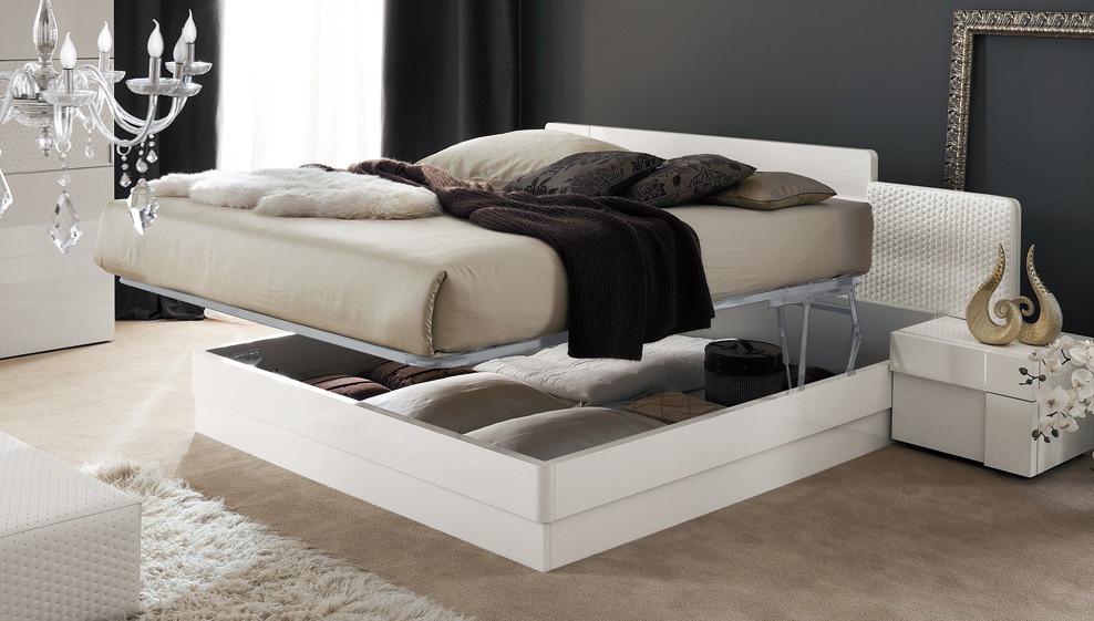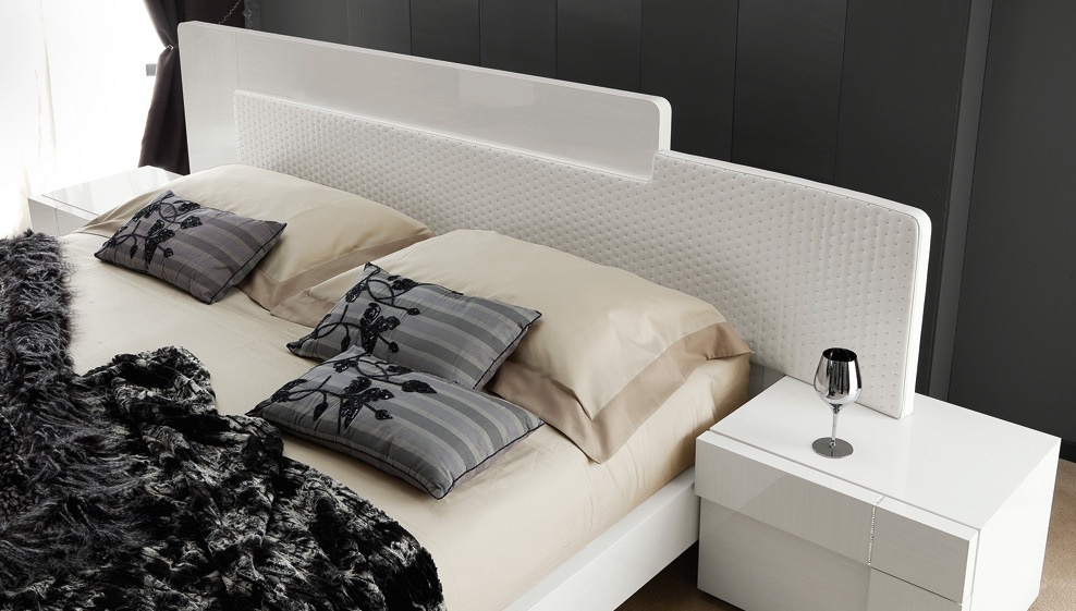Double bed Domino, a collection of Luxury, Italian furniture manufacturer Rossetto Armobil on a wooden frame. Finish - lacquered veneer white maple. Decoration is the insertion of STRASS® Swarovski® Crystal. A special feature is the wide headboard, which is upholstered in stamped faux leather.Rounded corners, side bars will save from injuries. The model is available with container for the linen in two sizes: for mattress of 160x200cm and 180x200cm