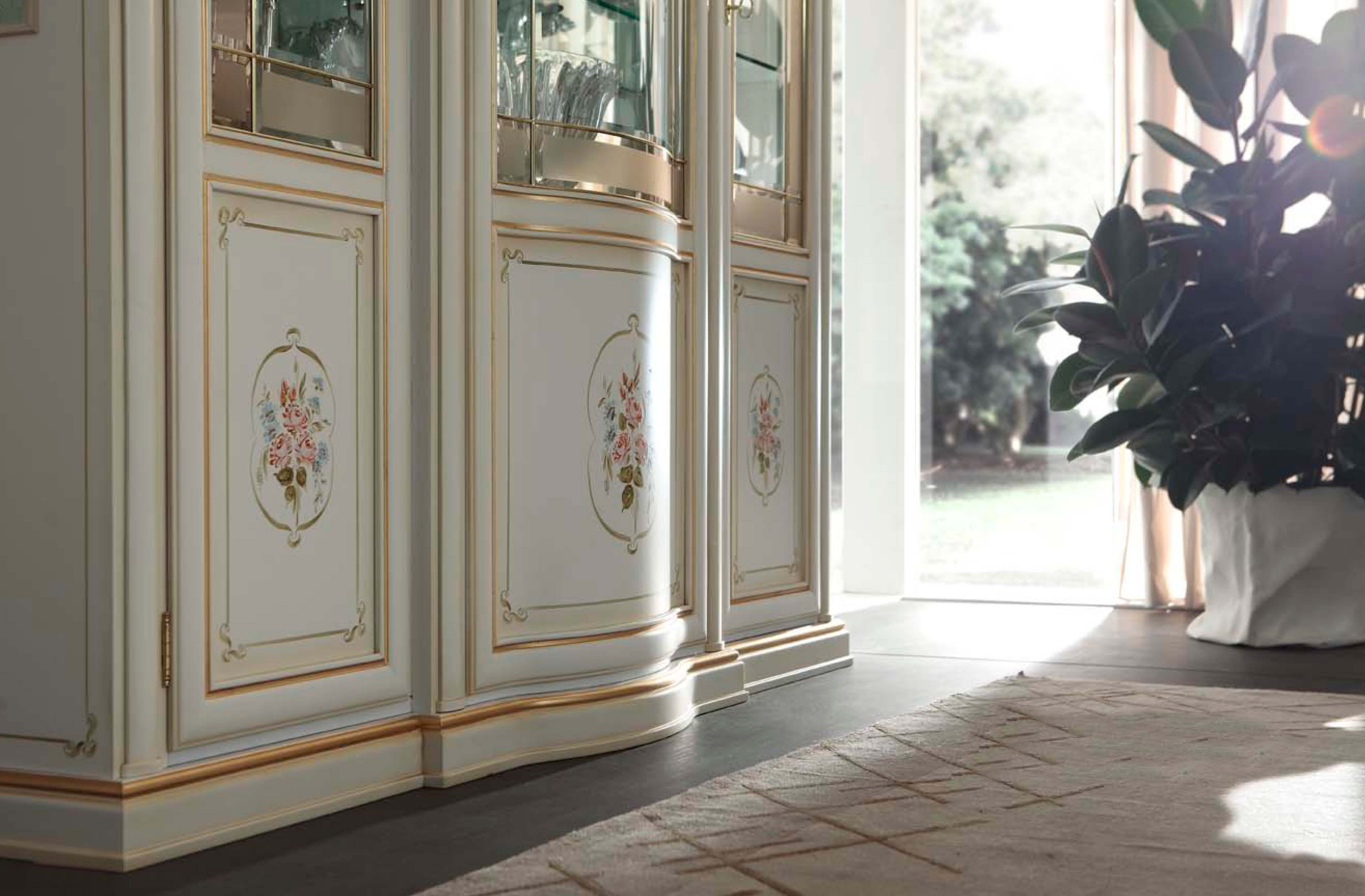 Showcase Milano from the Italian manufacturer Maronese. Showcase is made in the classic style. The frame is made of wood. The model has three doors, three glass shelves and three wooden shelves, mirrored back wall and internal light. Dining the crystal, reflected in the mirrored walls of Windows, looks a winner in tune with yourself atmosphere, surrounded by exquisite scenery, framed by a metal frame and satin processing decor glass door.
