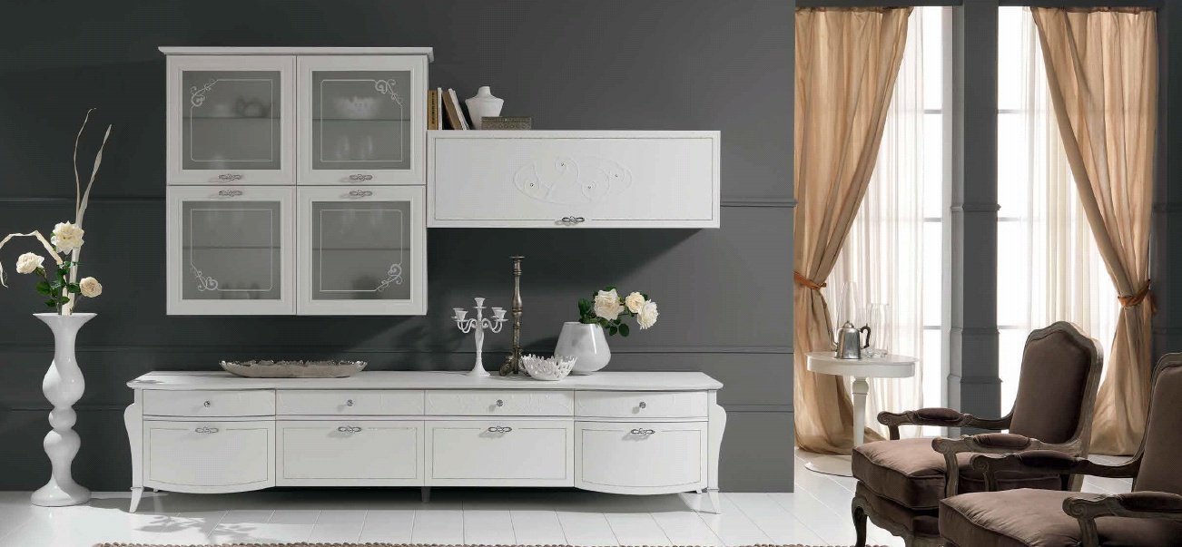 The wall presents for the living room in the style of art Nouveau. The finish on the Cabinet and fronts lacquer from the company portfolio. A distinctive feature of the collection - decor - painting on facades and the glass inserts of Swarovski crystals in the handles. Translucent glass in a wooden frame.