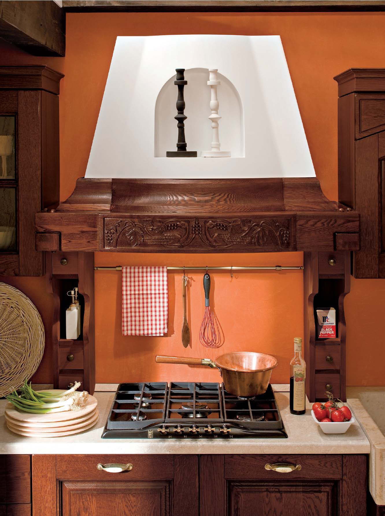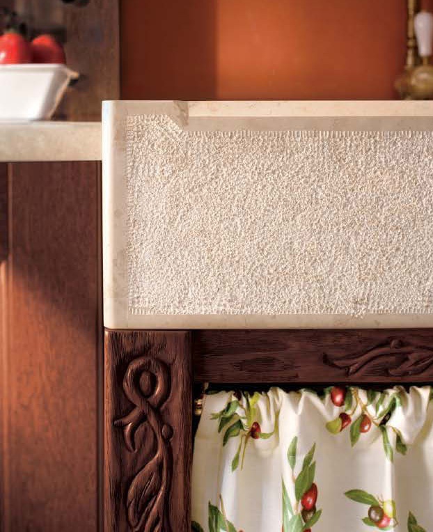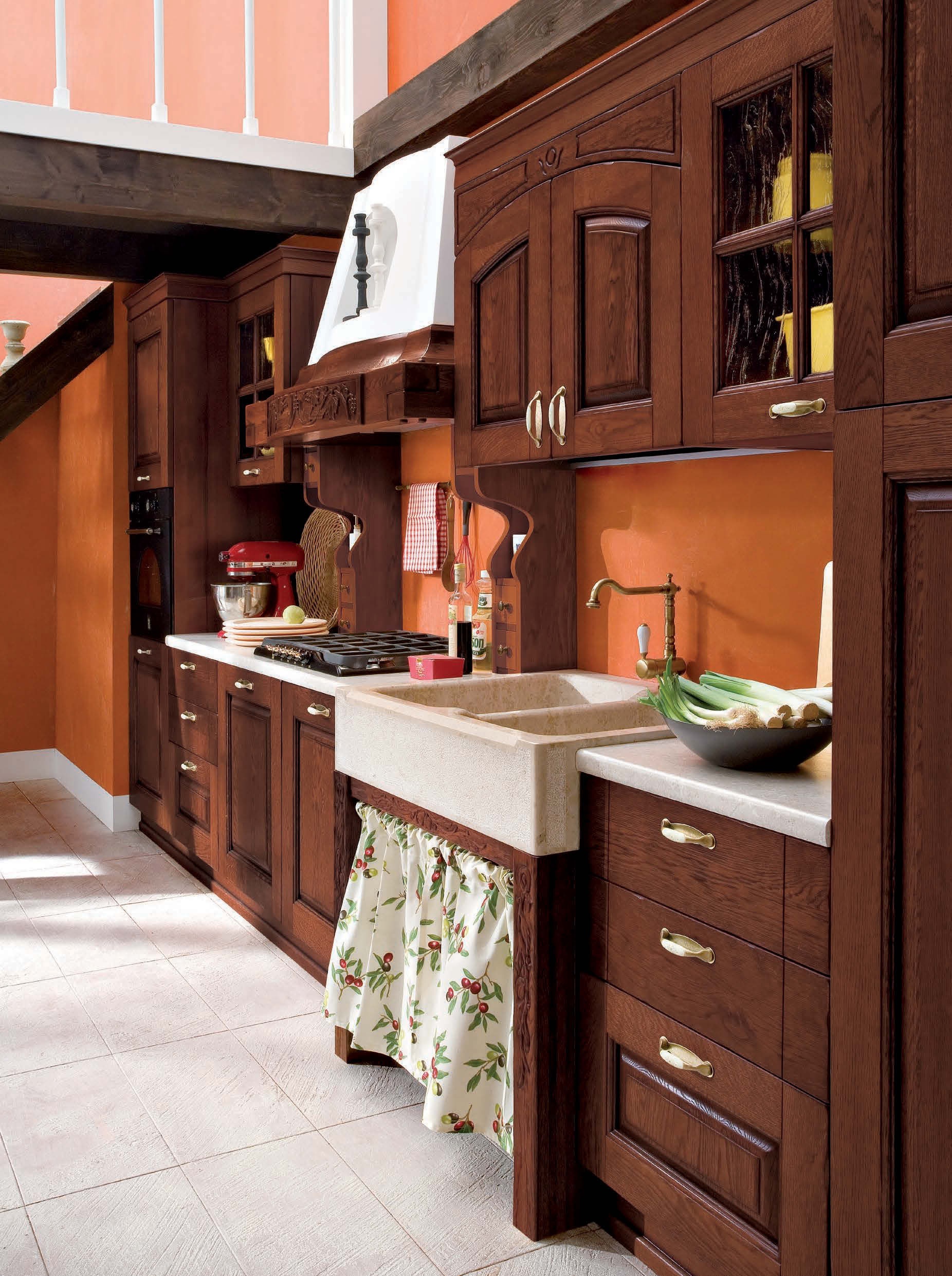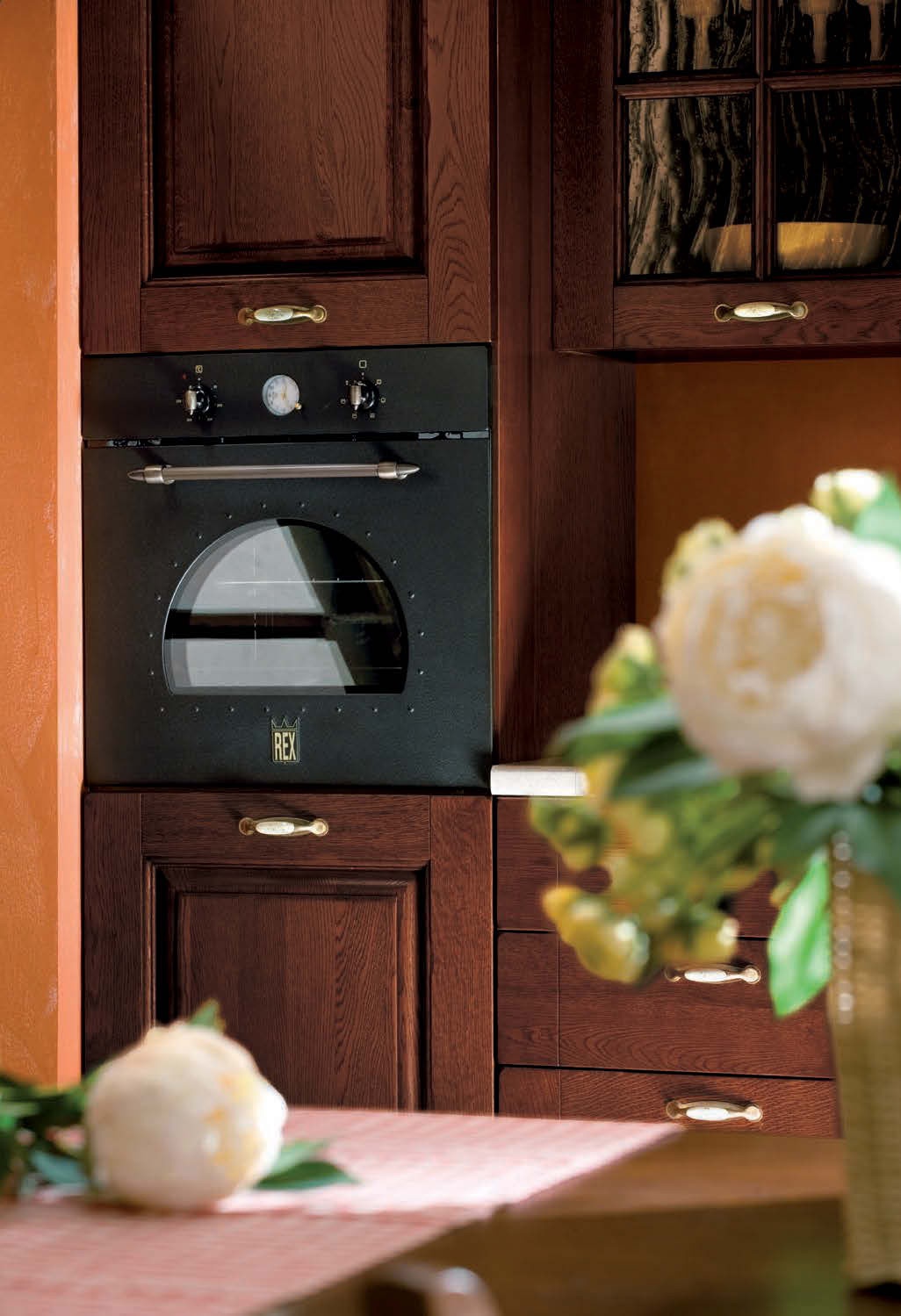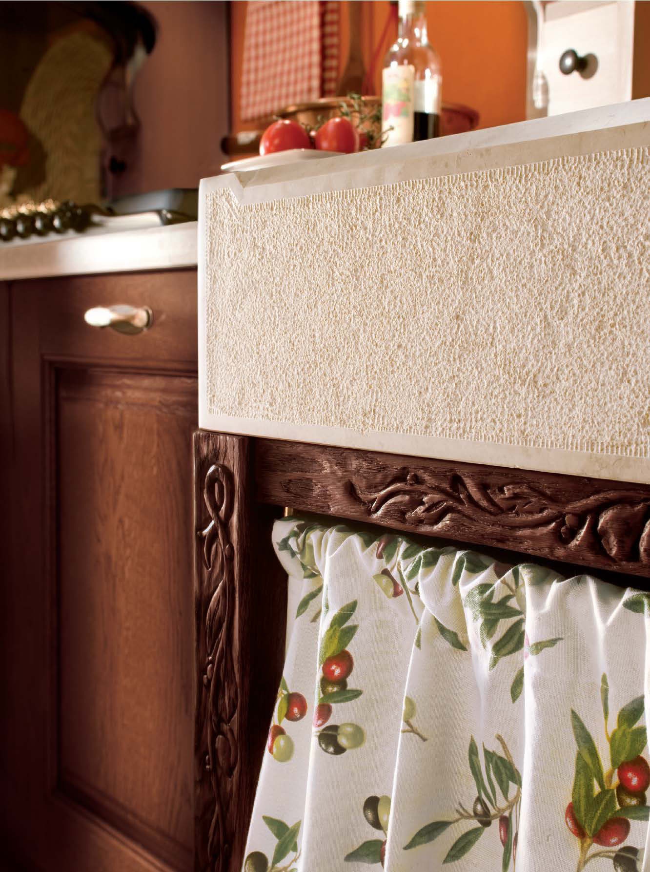 Kitchen Torretta comp.1 from the Italian manufacturer Ar-Tre. Frame kitchen is made of waterproof wood. Fronts made of solid oak with visible wood structure and glass pattern stained glass, bronze handles with ceramic inserts. Countertop made of artificial stone. Colors to choose from manufacturer's catalogue. Built-in appliances. The uniqueness and elegance are the basic elements of kitchen units Torretta. Made in the traditional style.