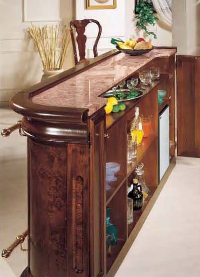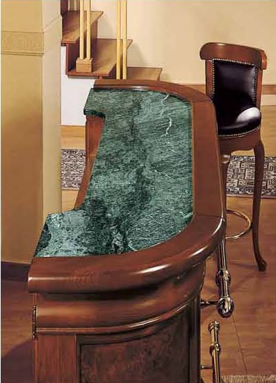 Bar (Suite bar) from the Italian manufacturer Mirandola Export. The model is made in classic style. Set consists of a bar Cabinet with shelves, drawers and mirrored back wall, bar counter with top of green or pink marble with a decorative pattern on the fa?ade and handrails, and bar stools with backrest and leather upholstery. Set will adorn Your interior.
