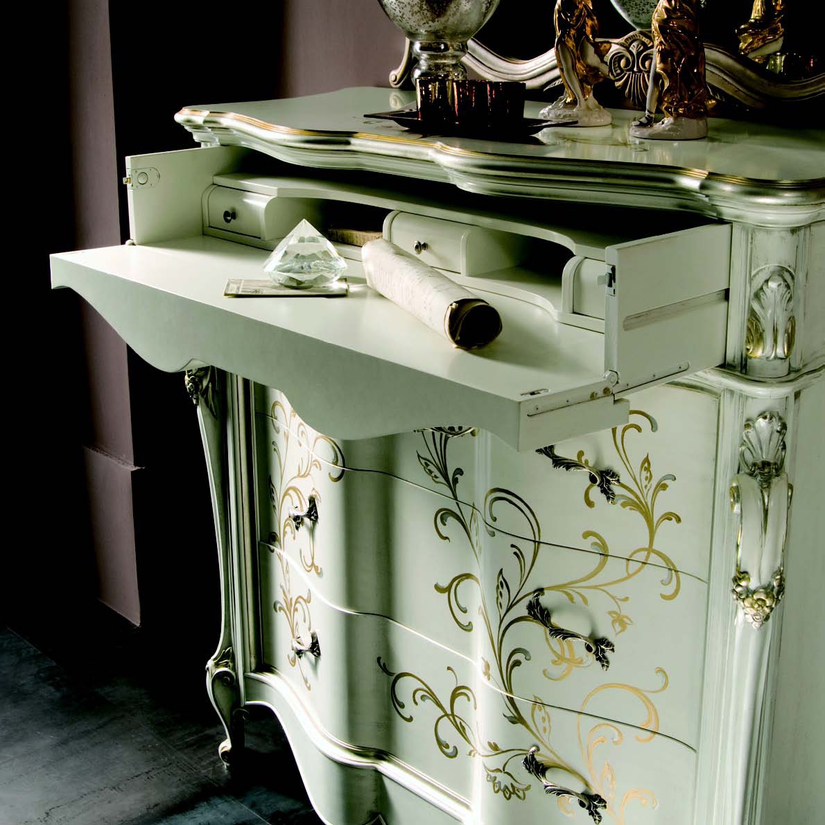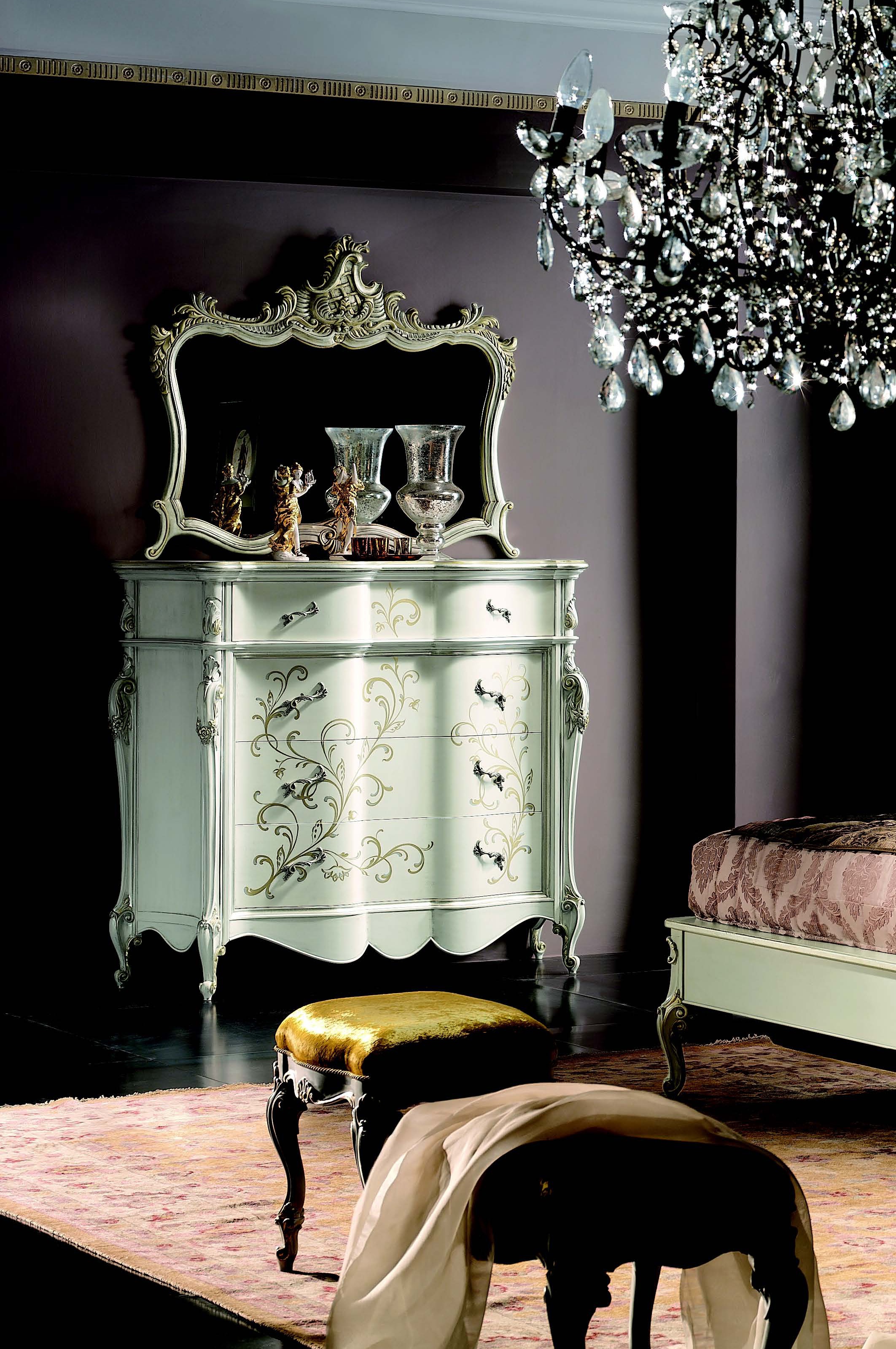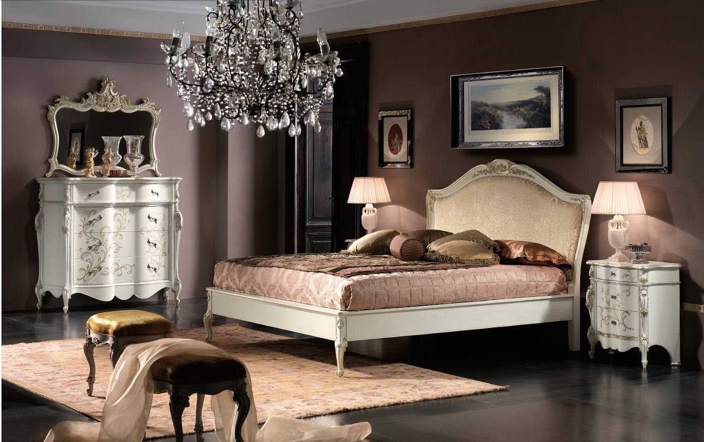 Headsets for bedrooms XXI Luigi from the Italian manufacturer Arve Style. This set includes: double bed with high upholstered headboard in finishing of textiles, bedside tables and a chest of drawers with exquisite fittings. Set made of solid wood, surface is covered with white lacquer. Accessories metal. Elaborately carved in gold, and painted facades are the main decor products. Set in classic style will fill the interior of a bedroom romantic atmosphere and luxury.