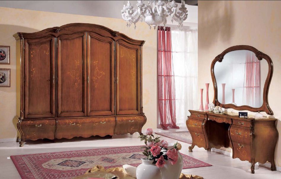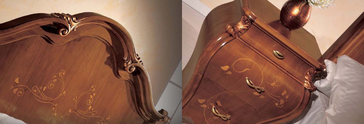 Set for bedroom Paradise from the Italian manufacturer Arve Style. The furniture set includes a bed with high carved headboard, bedside tables, chest of drawers, mirror, dressing table, wardrobe. Frame, frame products made of solid wood, finish - veneer out of range. The facade is decorated with exquisite inlays. Also, the decoration is hand carved. Set in classic style, bring comfort, luxury.