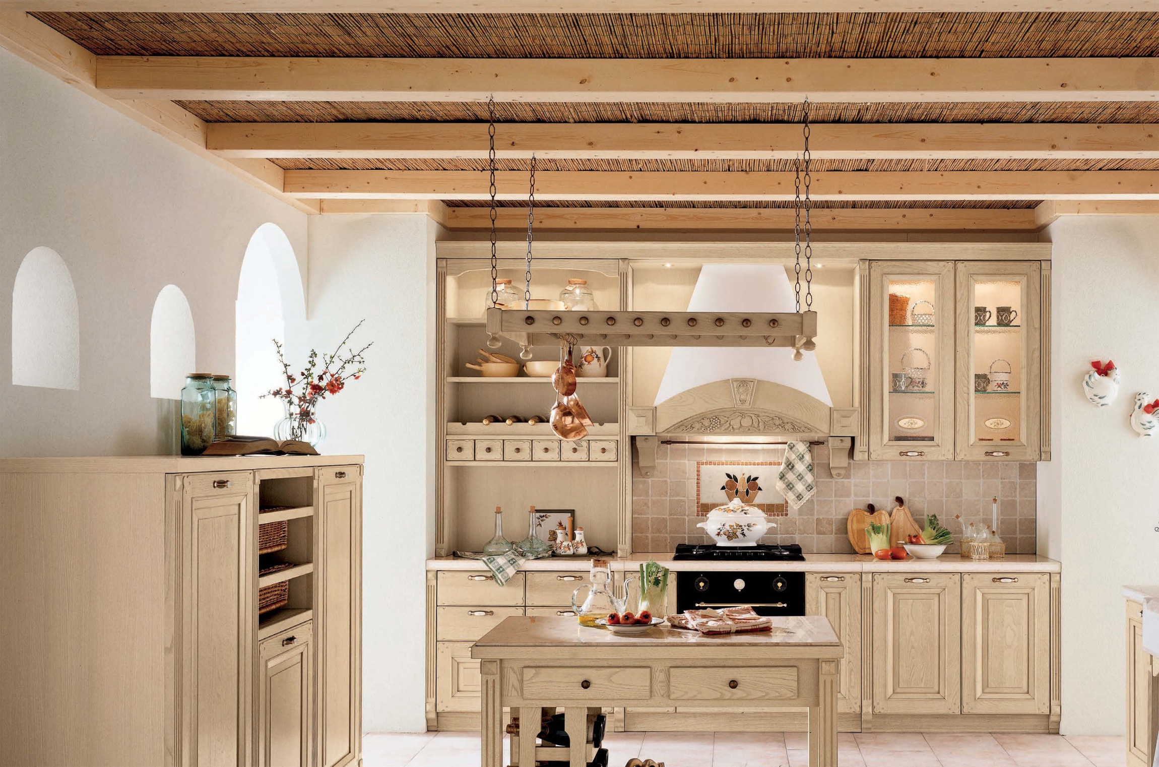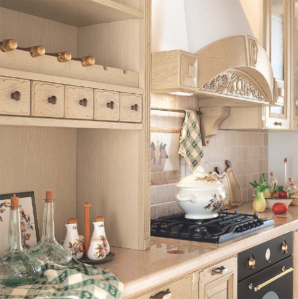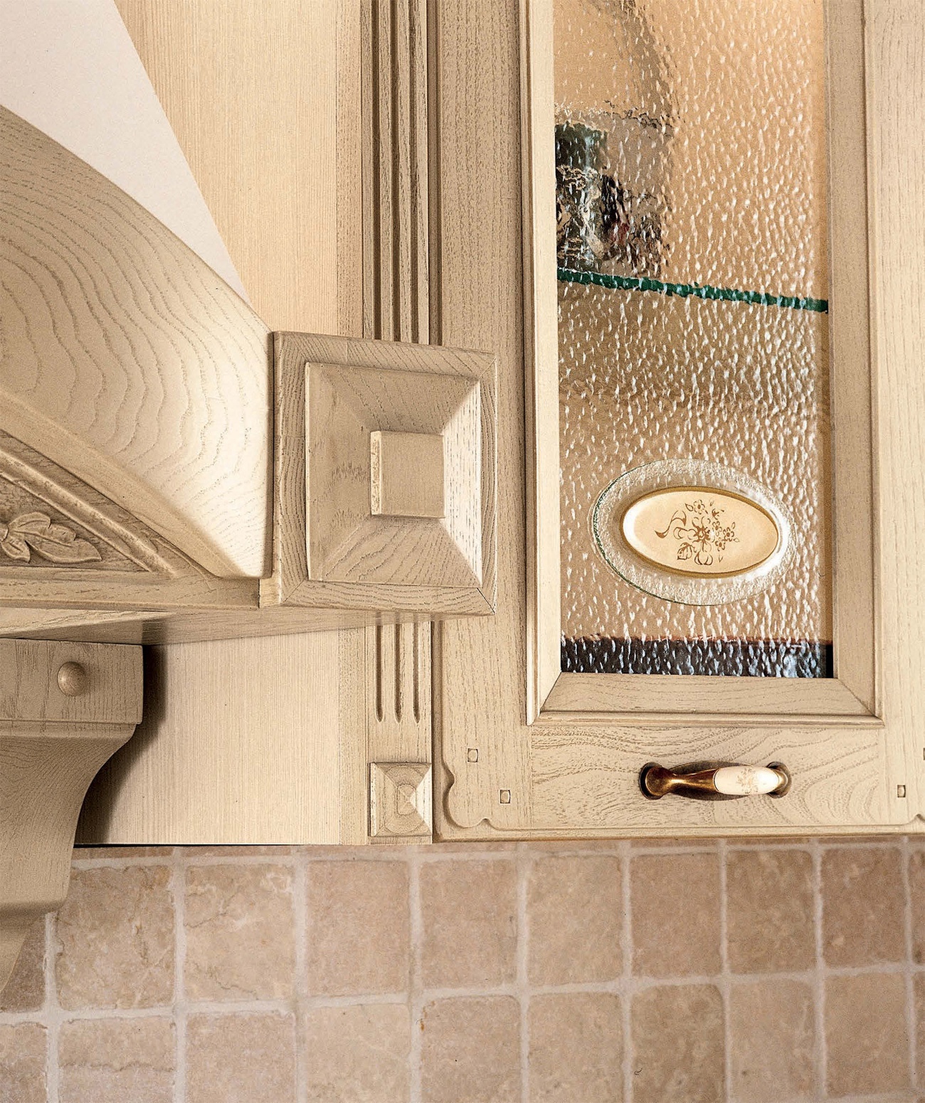 Kitchen'epoca comp.2 from the Italian manufacturer Ar-Tre. The structure of the kitchen made of waterproof wood. Fronts made of solid oak in the finish "Decape" beige tones with visible structure and glass with the effect of drizzle, knobs antique bronze with ceramic insert. The table-top working area is made of artificial stone. Colors to choose from manufacturer's catalogue. Built-in appliances. This model offers special features such as: suspension section for accessories, decorative extractor fan with hand-carved open compartment with compartment for bottles and a variety of suspension accessories and components. The facades are decorated with exquisite carvings and furniture nails. Great classic solution for decorating Your kitchen.
