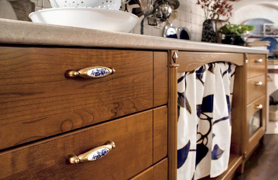 Kitchen Contessa comp.2 from the Italian manufacturer Ar-Tre. Structure made of water-repellent wood. Fronts made of solid cherry with visible structure of wood and glass, decorated handles of bronze, and ceramics. Countertop made of artificial stone, cooking area made of ceramic tiles. Colors to choose from manufacturer's catalogue. Built-in appliances. The combination of elegant design and carefully selected materials allow us to create solutions that combine aesthetics and functionality. A classic solution for Your kitchen.