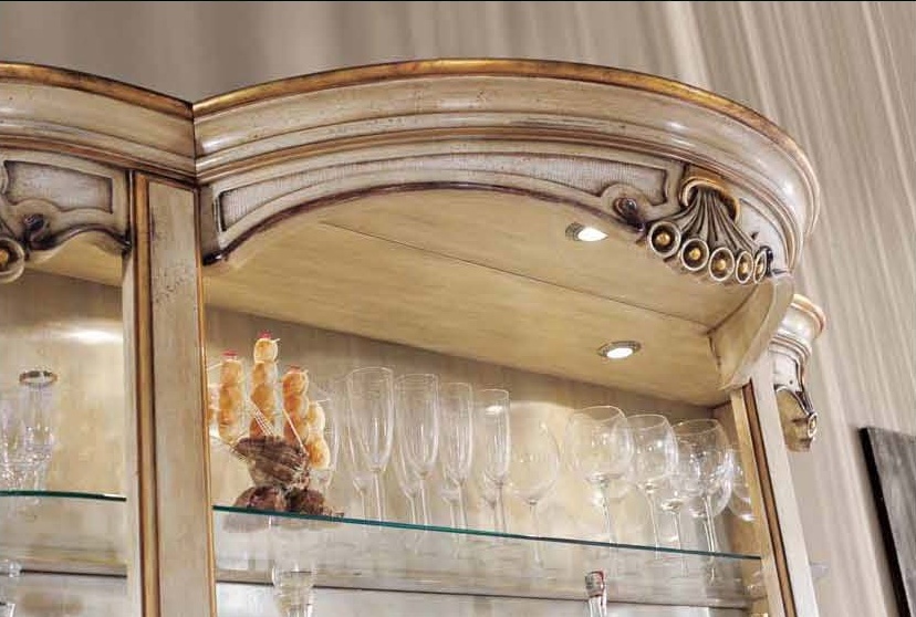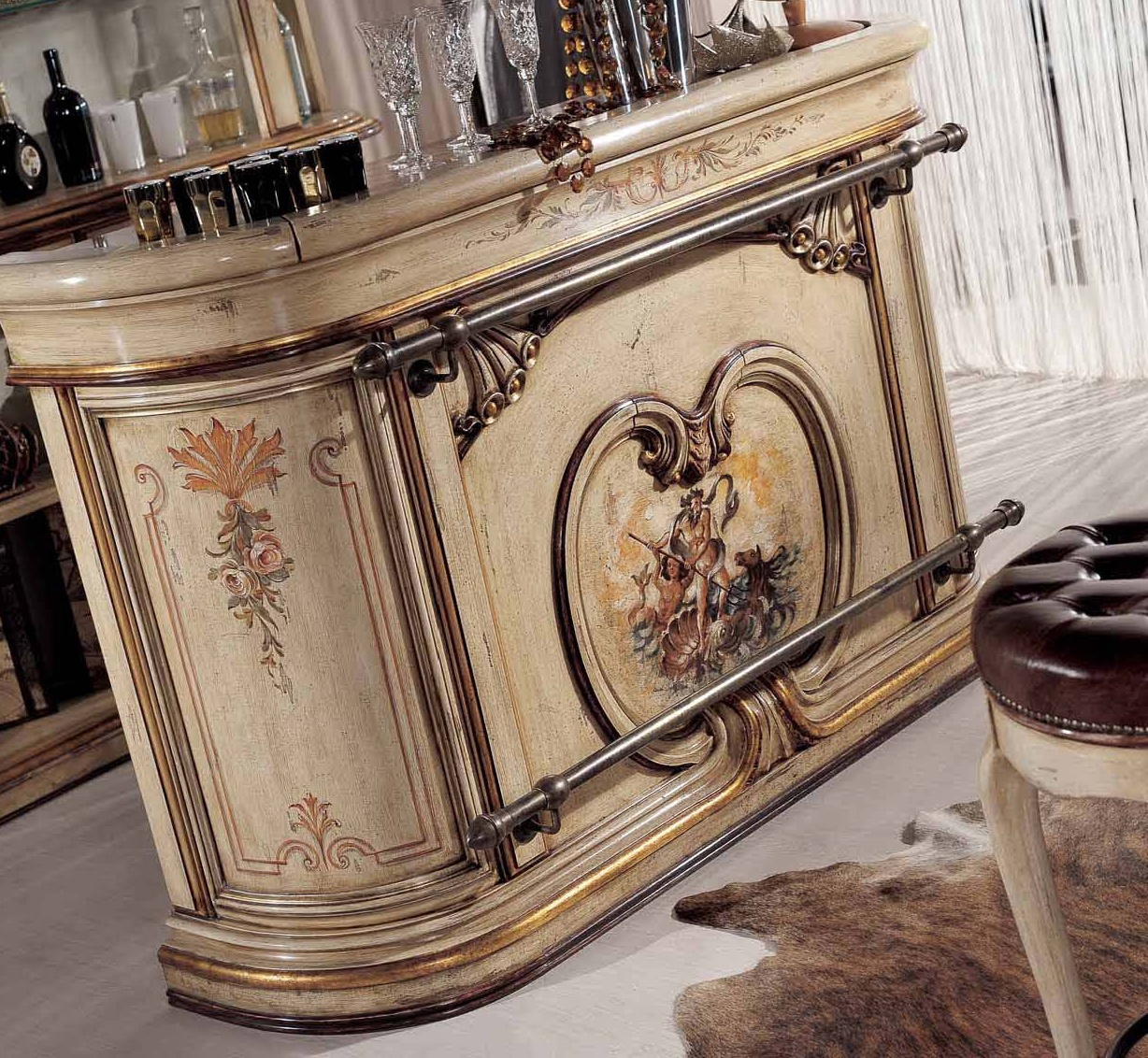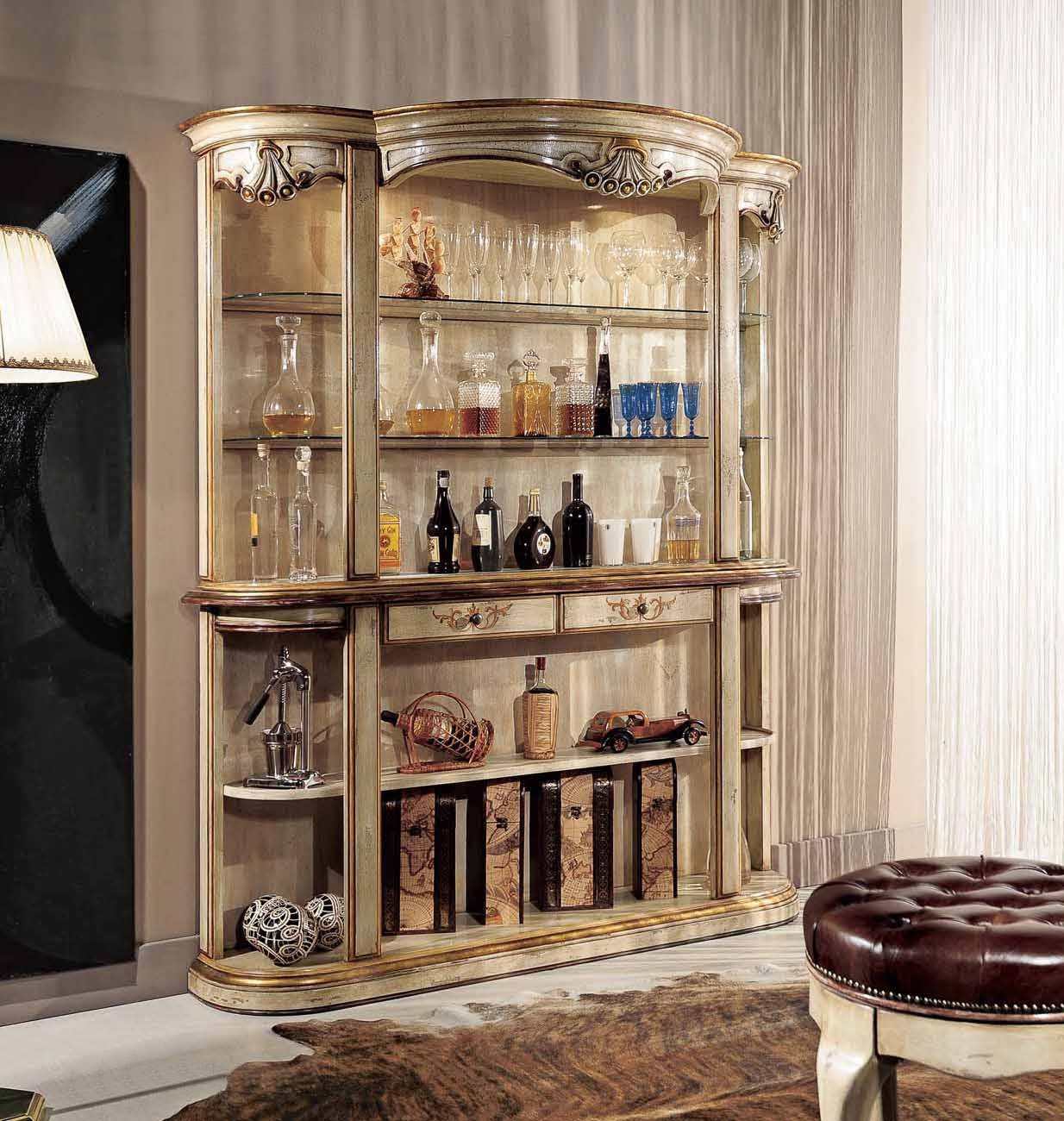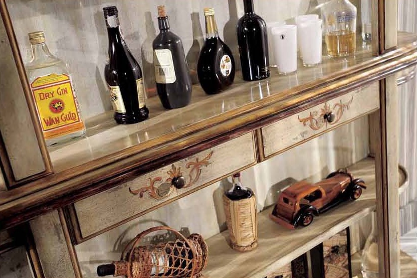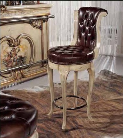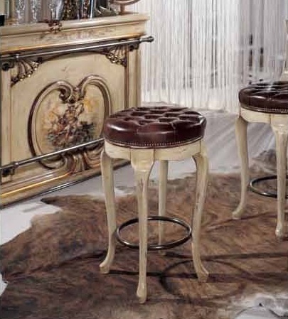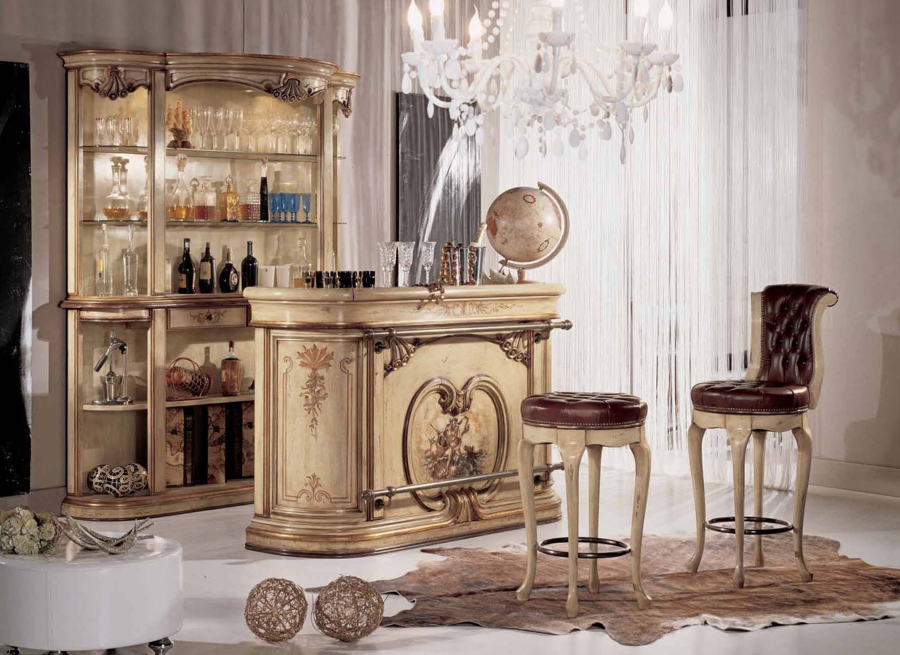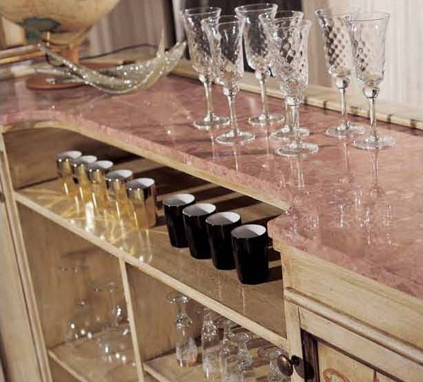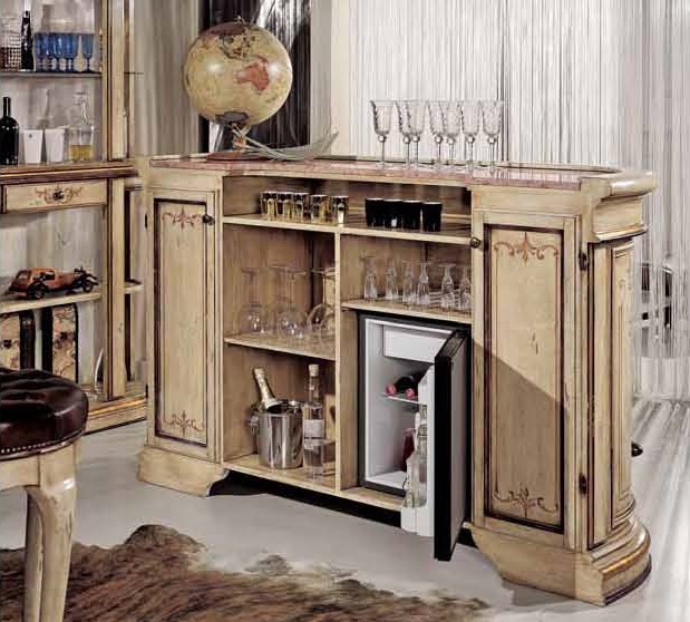 Bar (Suite bar) from the Italian manufacturer Mirandola Export. The products are made in a classic style with antique finish. Set consists of bar counter, bar stools with or without backrest and bar Cabinet with lighting. The frame is made of wood, worktop in pink or green marble, upholstered chairs leather. Elegant design, fine finish and beautiful pattern on the facade makes the set perfect for Your interior.
