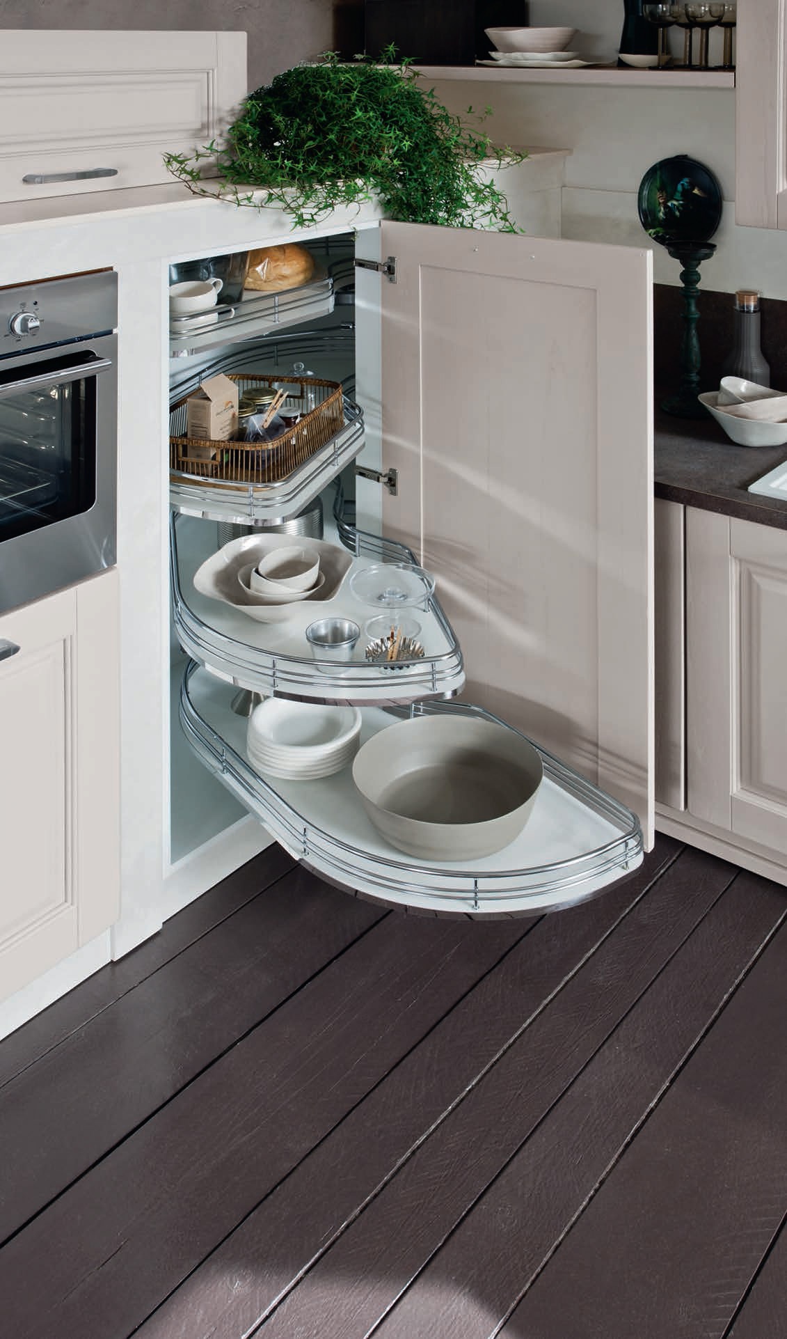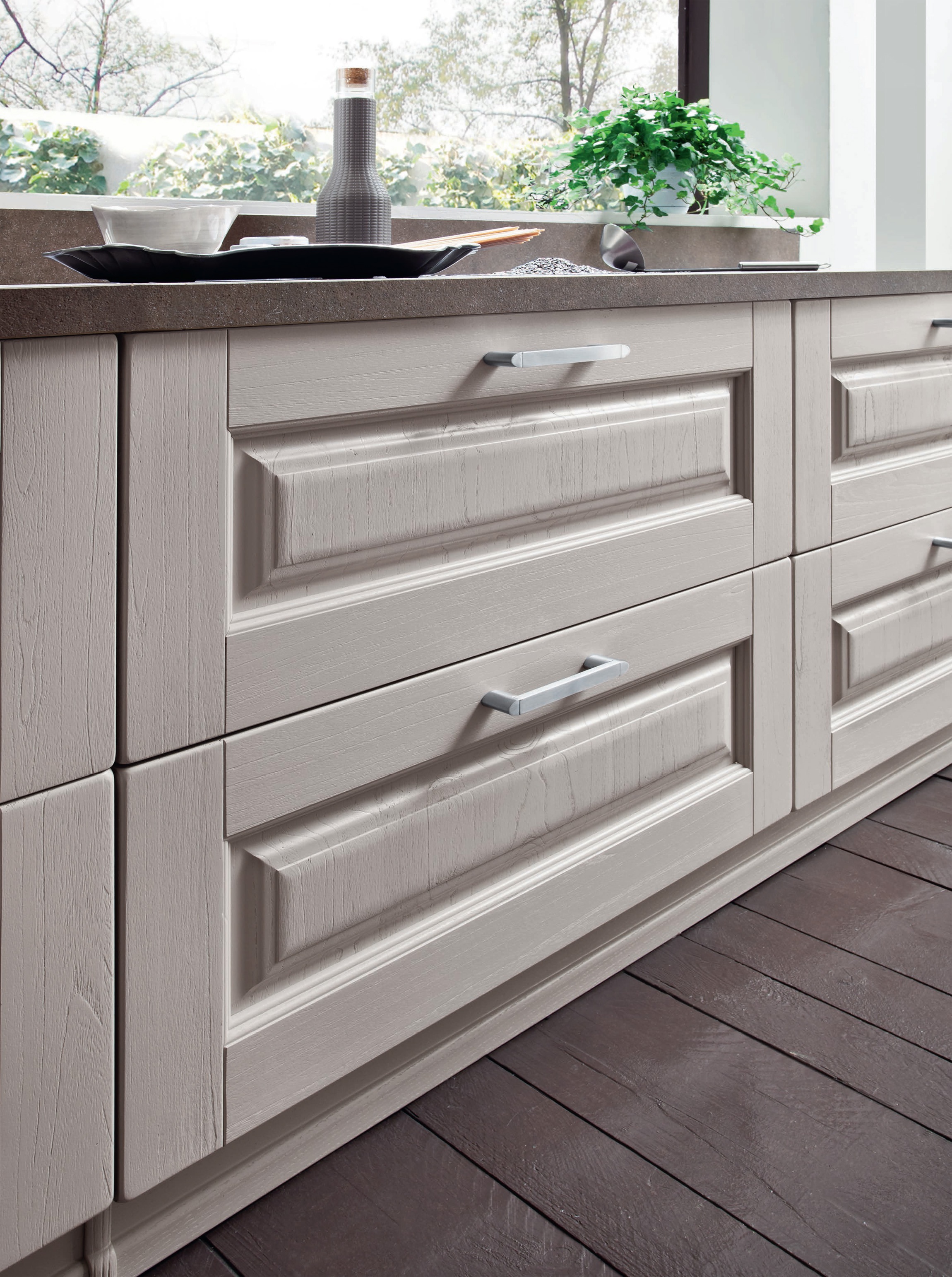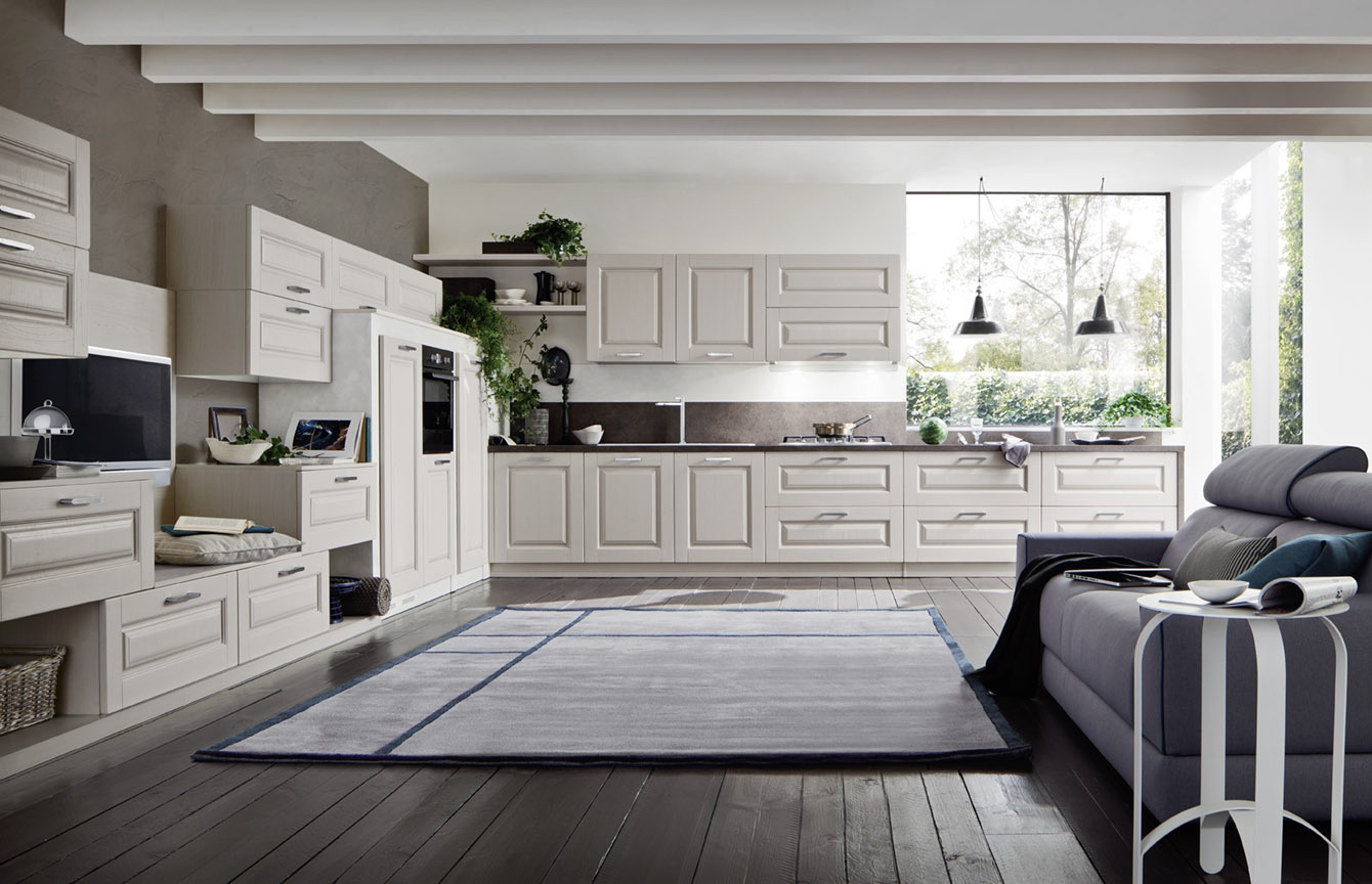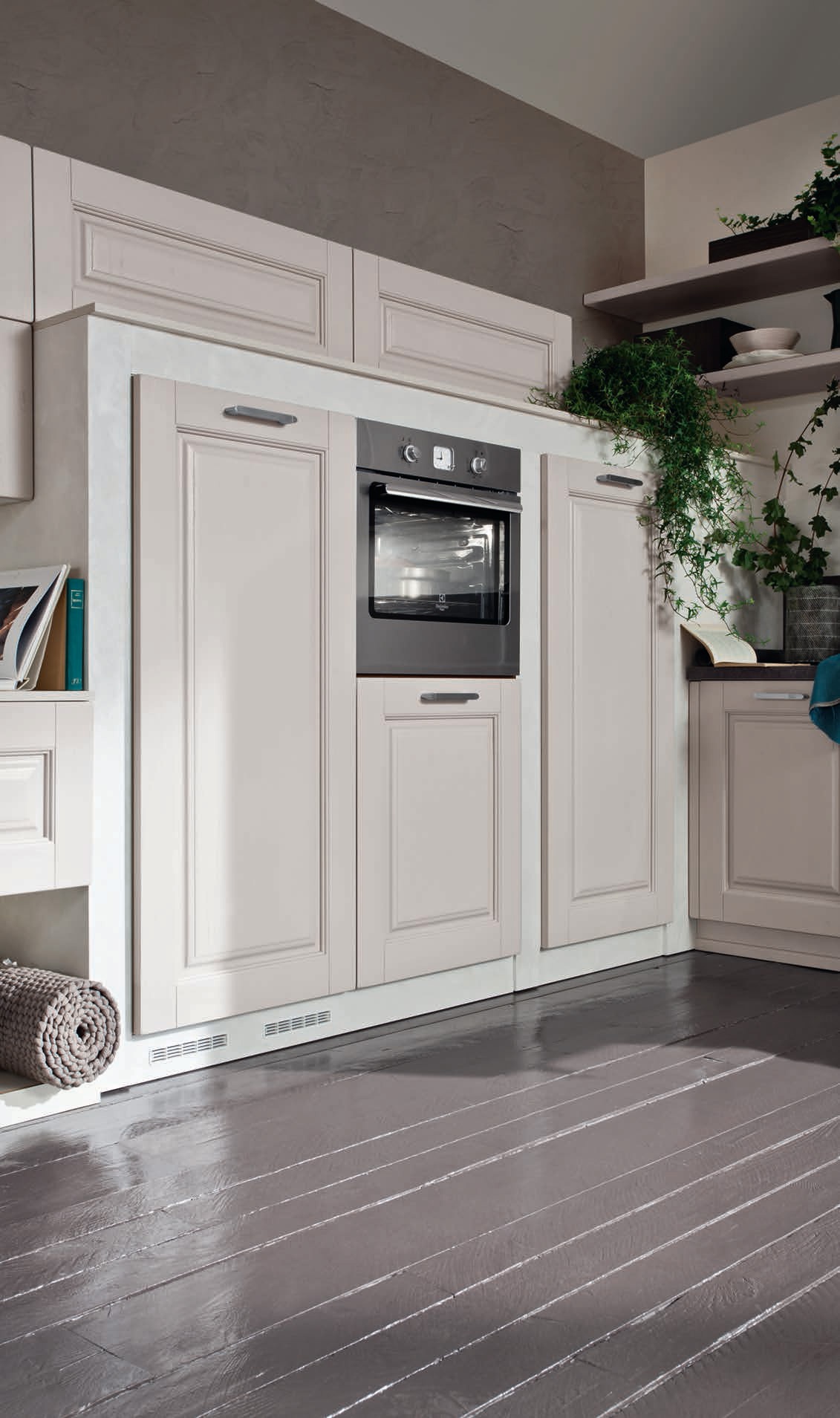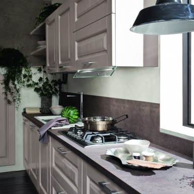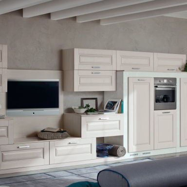 Kitchen Olimpia from Cremona Italian manufacturer of Ar-Tre. The structure of the kitchen made of waterproof wood. The facades in beige tone with visible structure of wood, metal handles. Countertop made of artificial stone. Colors to choose from manufacturer's catalogue. Built-in appliances. This configuration erases all the stereotypes in the construction of the kitchen, combining kitchen and living areas together. The rich detail, modern inner filling and lighting of working area - increase the functionality of the kitchen. Classical style with elements of modernity.