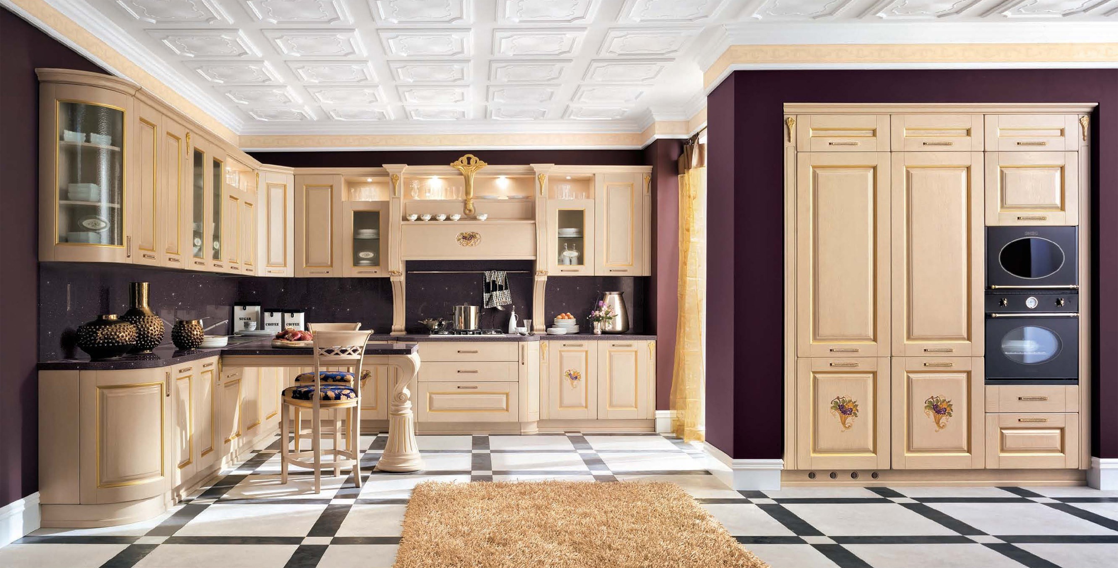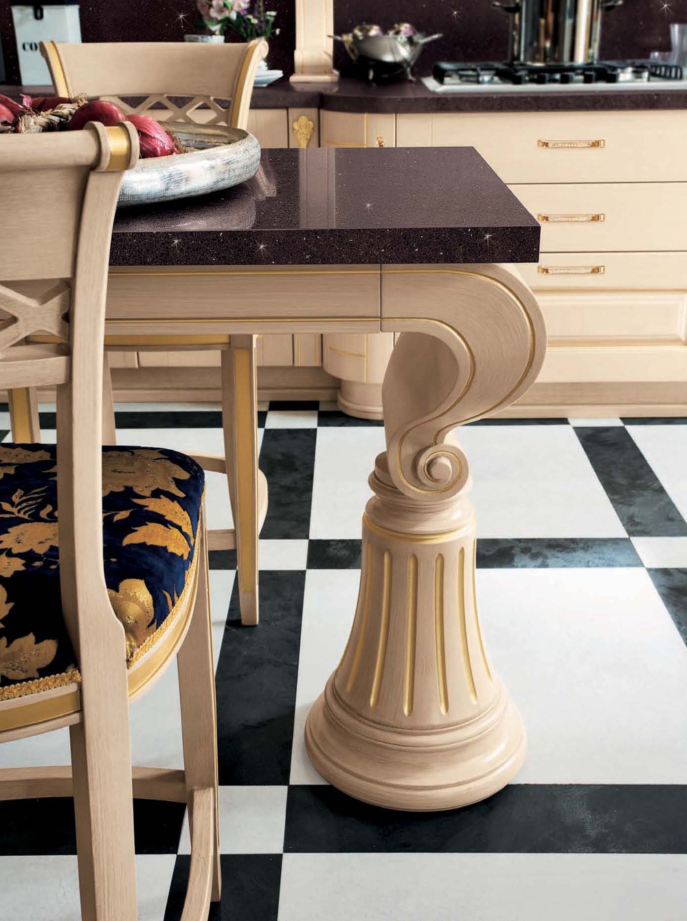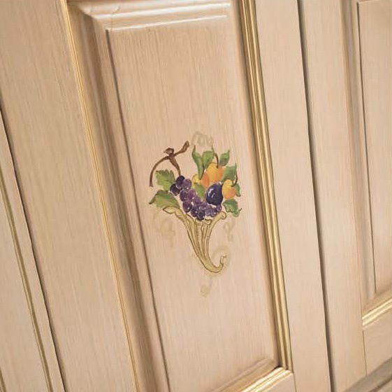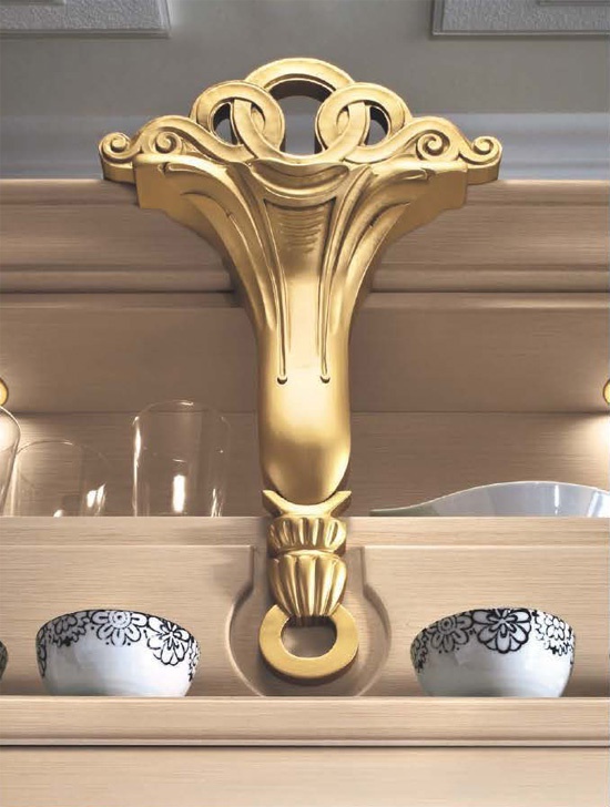 Kitchen Dora Augusta comp.1 from the Italian manufacturer Ar-Tre. Frame kitchen is made of waterproof wood. The facades in beige patinated tone with visible structure of wood and glass doors with a decorative pattern, handle with gold plating and Swarovski crystals. Countertop made of quartzite. Colors to choose from manufacturer's catalogue. The model shows skillful craftsmanship of artisans, slim classic style, decorative columns with gold leaf, functional elements and a clear compositional harmony. The perfect solution for Your kitchen.