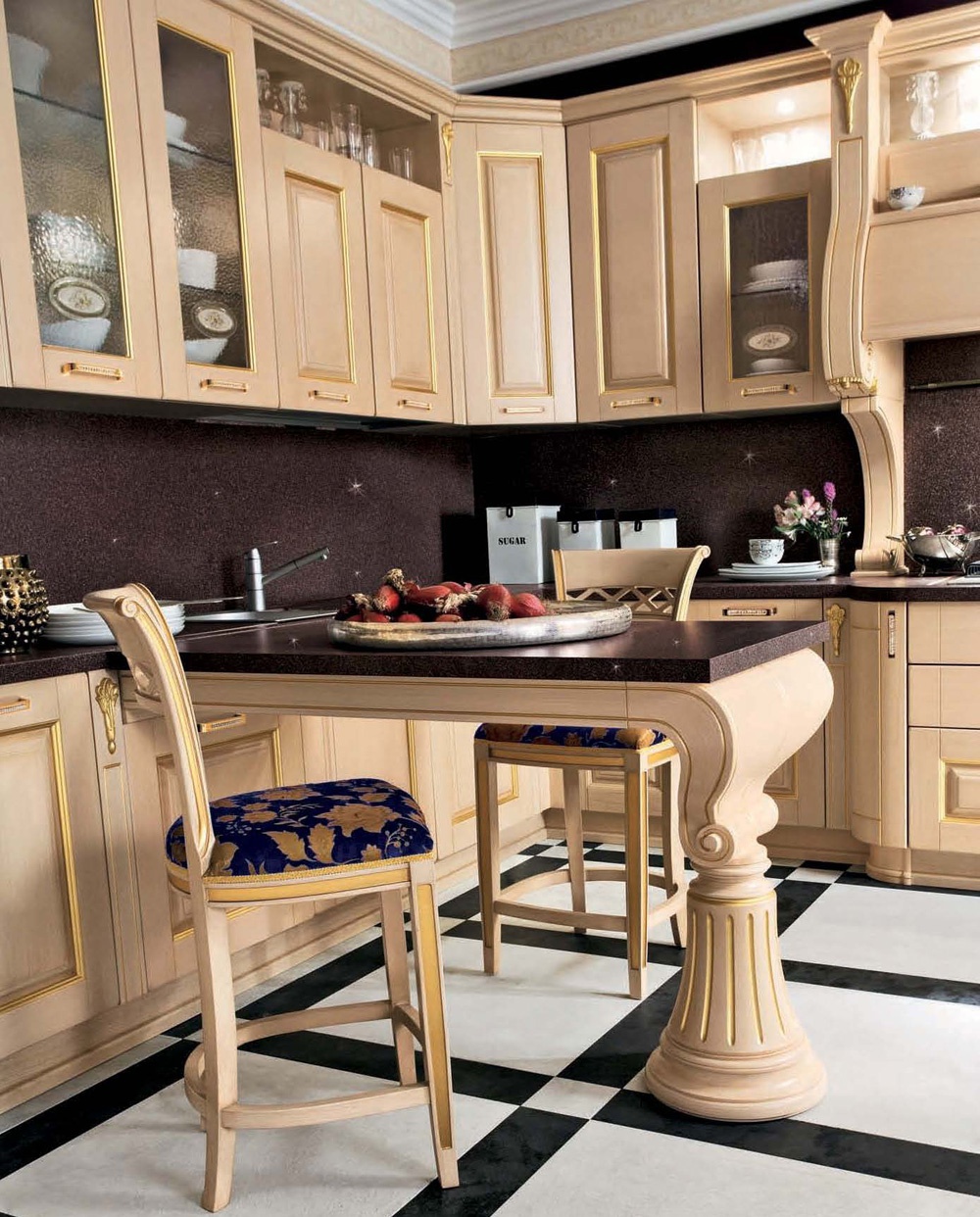 structure: wood facades: wood countertop: quarzit facades: glass handles: gold handles: Swarovski crystal decors: carved facades, decors: gilding |