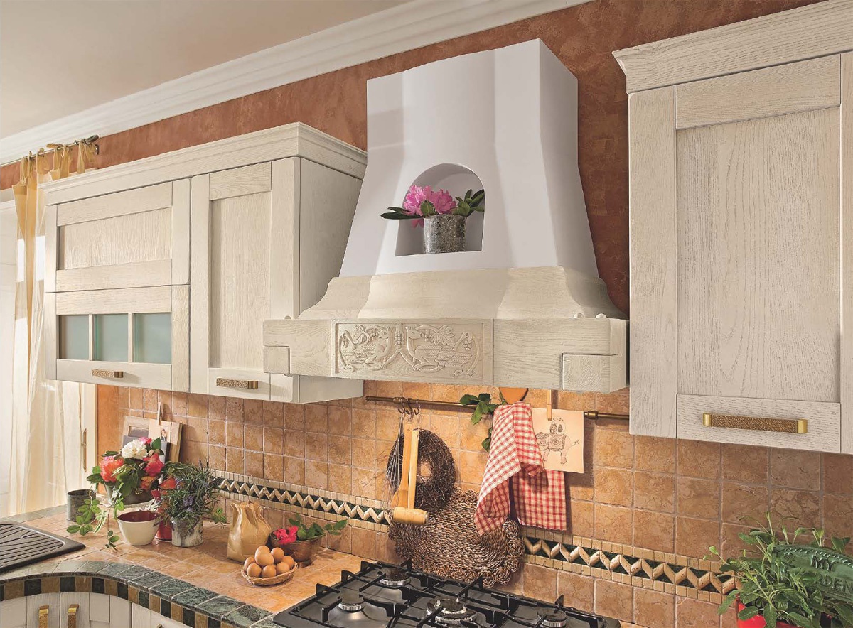 structure: wood facades: ash facades: Satinato (matte) countertop: ceramics handles: bronze facades: lacquered hood: carved |
